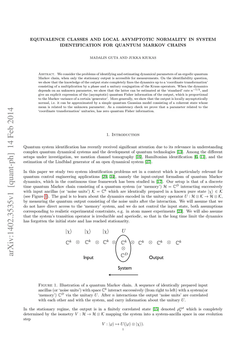 We consider the problems of identifying and estimating dynamical parameters of an ergodic quantum Markov chain, when only the stationary output is accessible for measurements. On the identifiability question, we show that the knowledge of the output state completely fixes the dynamics up to a `coordinate transformation' consisting of a multiplication by a phase and a unitary conjugation of the Kraus operators. When the dynamics depends on an unknown parameter, we show that the latter can be estimated at the `standard' rate , and give an explicit expression of the (asymptotic) quantum Fisher information of the output, which is proportional to the Markov variance of a certain `generator'. More generally, we show that the output is locally asymptotically normal, i.e. it can be approximated by a simple quantum Gaussian model consisting of a coherent state whose mean is related to the unknown parameter. As a consistency check we prove that a parameter related to the `coordinate transformation' unitaries, has zero quantum Fisher information.