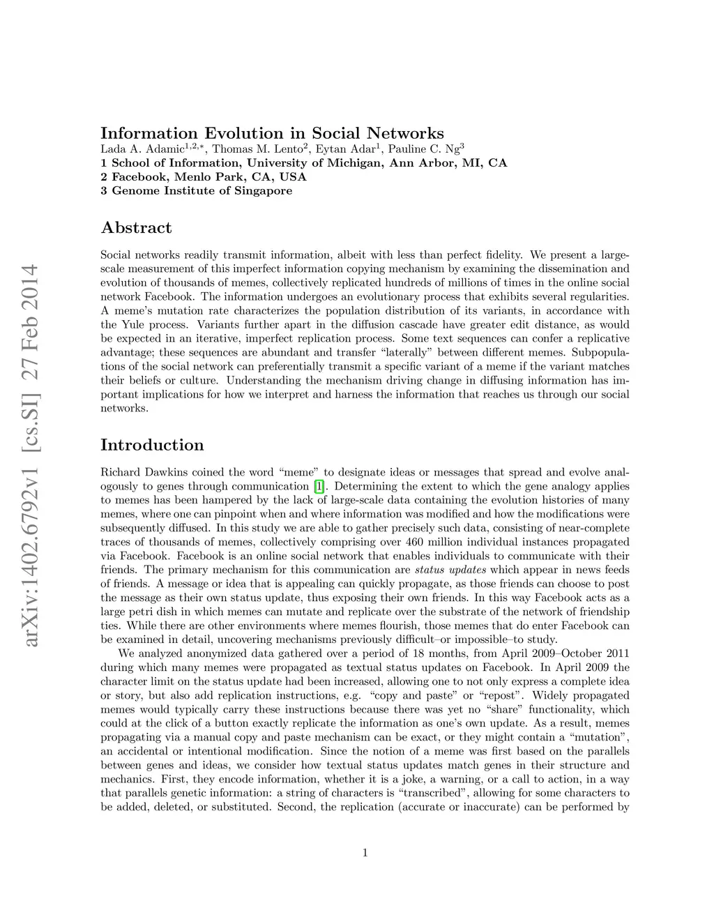 Social networks readily transmit information, albeit with less than perfect fidelity. We present a large-scale measurement of this imperfect information copying mechanism by examining the dissemination and evolution of thousands of memes, collectively replicated hundreds of millions of times in the online social network Facebook. The information undergoes an evolutionary process that exhibits several regularities. A meme's mutation rate characterizes the population distribution of its variants, in accordance with the Yule process. Variants further apart in the diffusion cascade have greater edit distance, as would be expected in an iterative, imperfect replication process. Some text sequences can confer a replicative advantage; these sequences are abundant and transfer "laterally" between different memes. Subpopulations of the social network can preferentially transmit a specific variant of a meme if the variant matches their beliefs or culture. Understanding the mechanism driving change in diffusing information has important implications for how we interpret and harness the information that reaches us through our social networks.