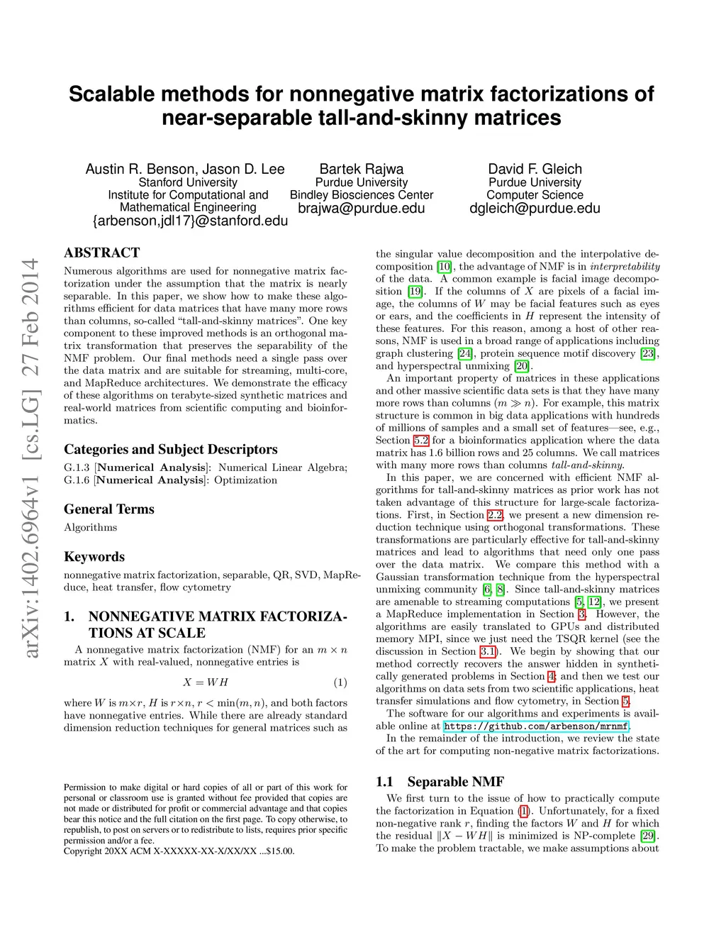 Scalable methods for nonnegative matrix factorizations of near-separable