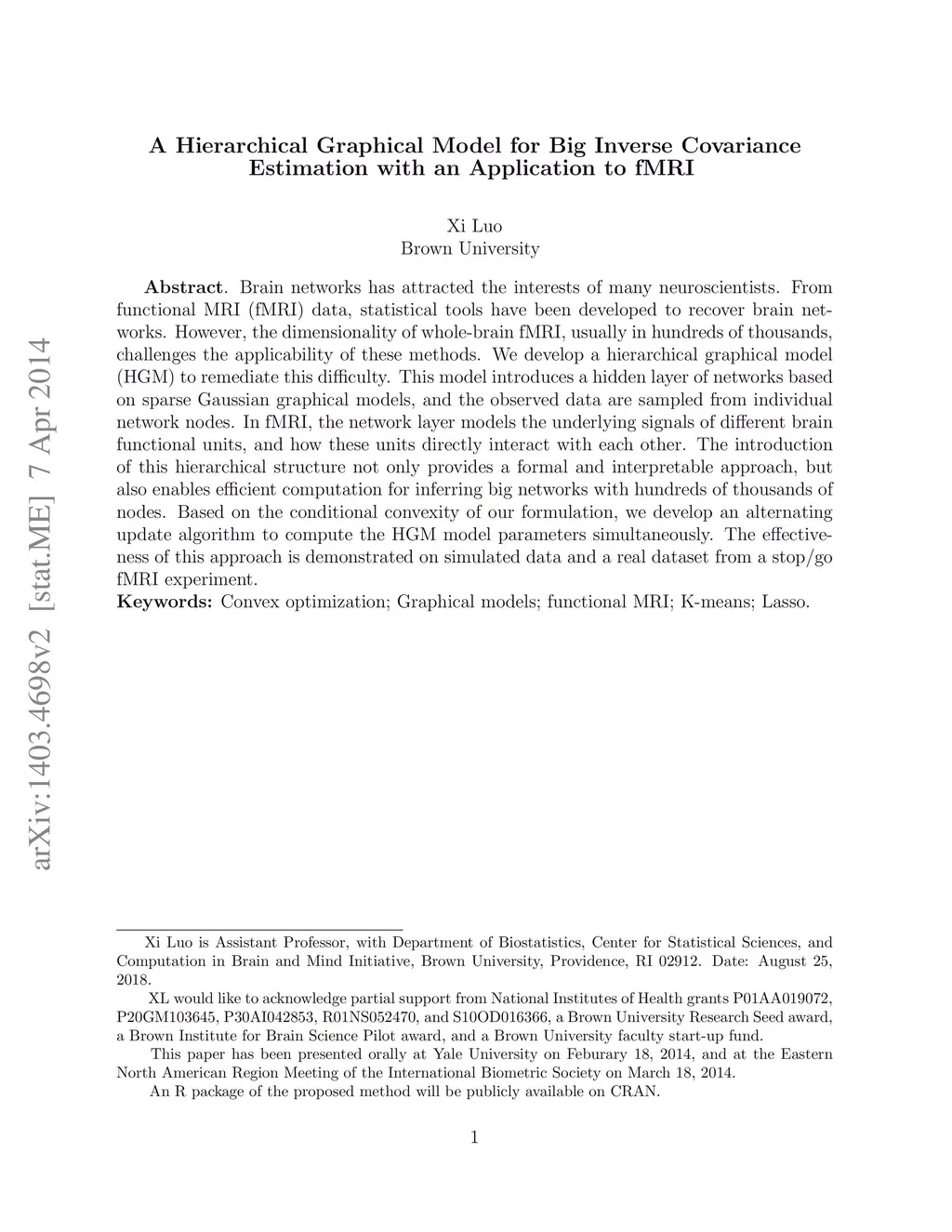 Brain networks has attracted the interests of many neuroscientists. From functional MRI (fMRI) data, statistical tools have been developed to recover brain networks. However, the dimensionality of whole-brain fMRI, usually in hundreds of thousands, challenges the applicability of these methods. We develop a hierarchical graphical model (HGM) to remediate this difficulty. This model introduces a hidden layer of networks based on sparse Gaussian graphical models, and the observed data are sampled from individual network nodes. In fMRI, the network layer models the underlying signals of different brain functional units, and how these units directly interact with each other. The introduction of this hierarchical structure not only provides a formal and interpretable approach, but also enables efficient computation for inferring big networks with hundreds of thousands of nodes. Based on the conditional convexity of our formulation, we develop an alternating update algorithm to compute the HGM model parameters simultaneously. The effectiveness of this approach is demonstrated on simulated data and a real dataset from a stop/go fMRI experiment.