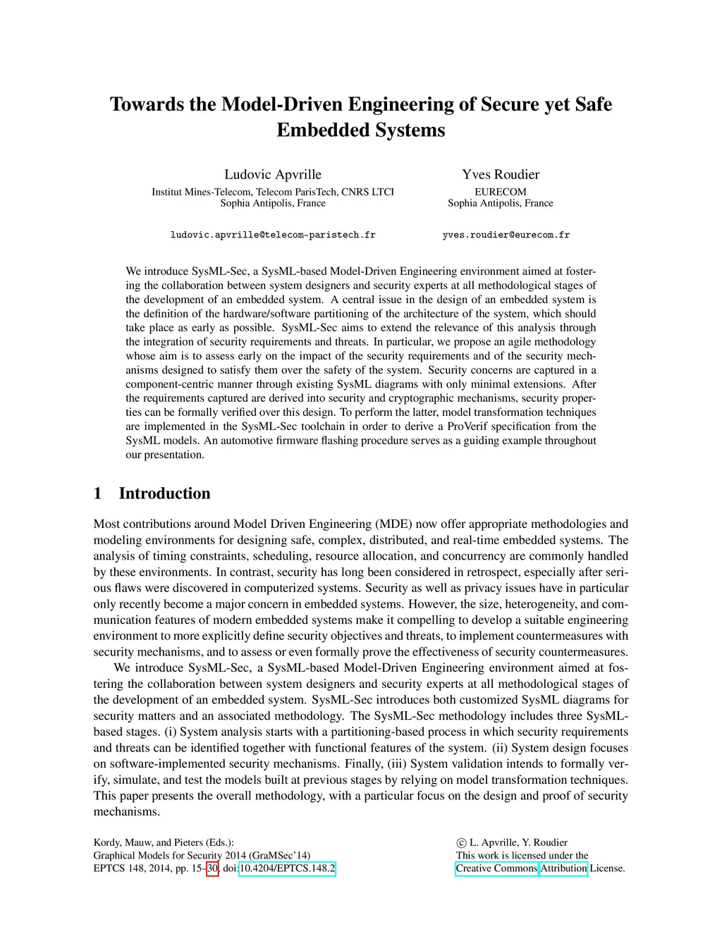 We introduce SysML-Sec, a SysML-based Model-Driven Engineering environment aimed at fostering the collaboration between system designers and security experts at all methodological stages of the development of an embedded system. A central issue in the design of an embedded system is the definition of the hardware/software partitioning of the architecture of the system, which should take place as early as possible. SysML-Sec aims to extend the relevance of this analysis through the integration of security requirements and threats. In particular, we propose an agile methodology whose aim is to assess early on the impact of the security requirements and of the security mechanisms designed to satisfy them over the safety of the system. Security concerns are captured in a component-centric manner through existing SysML diagrams with only minimal extensions. After the requirements captured are derived into security and cryptographic mechanisms, security properties can be formally verified over this design. To perform the latter, model transformation techniques are implemented in the SysML-Sec toolchain in order to derive a ProVerif specification from the SysML models. An automotive firmware flashing procedure serves as a guiding example throughout our presentation.