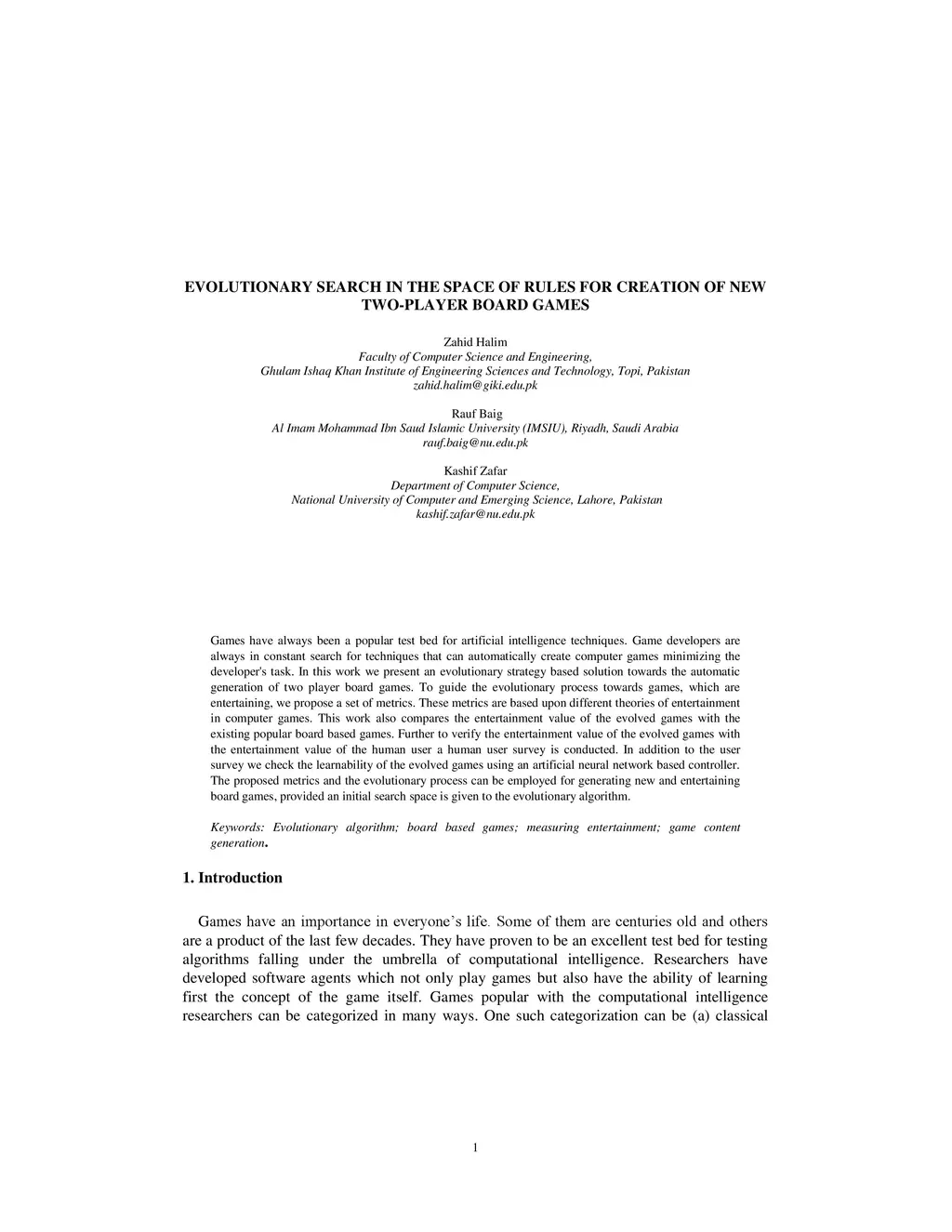 Games have always been a popular test bed for artificial intelligence techniques. Game developers are always in constant search for techniques that can automatically create computer games minimizing the developer's task. In this work we present an evolutionary strategy based solution towards the automatic generation of two player board games. To guide the evolutionary process towards games, which are entertaining, we propose a set of metrics. These metrics are based upon different theories of entertainment in computer games. This work also compares the entertainment value of the evolved games with the existing popular board based games. Further to verify the entertainment value of the evolved games with the entertainment value of the human user a human user survey is conducted. In addition to the user survey we check the learnability of the evolved games using an artificial neural network based controller. The proposed metrics and the evolutionary process can be employed for generating new and entertaining board games, provided an initial search space is given to the evolutionary algorithm.