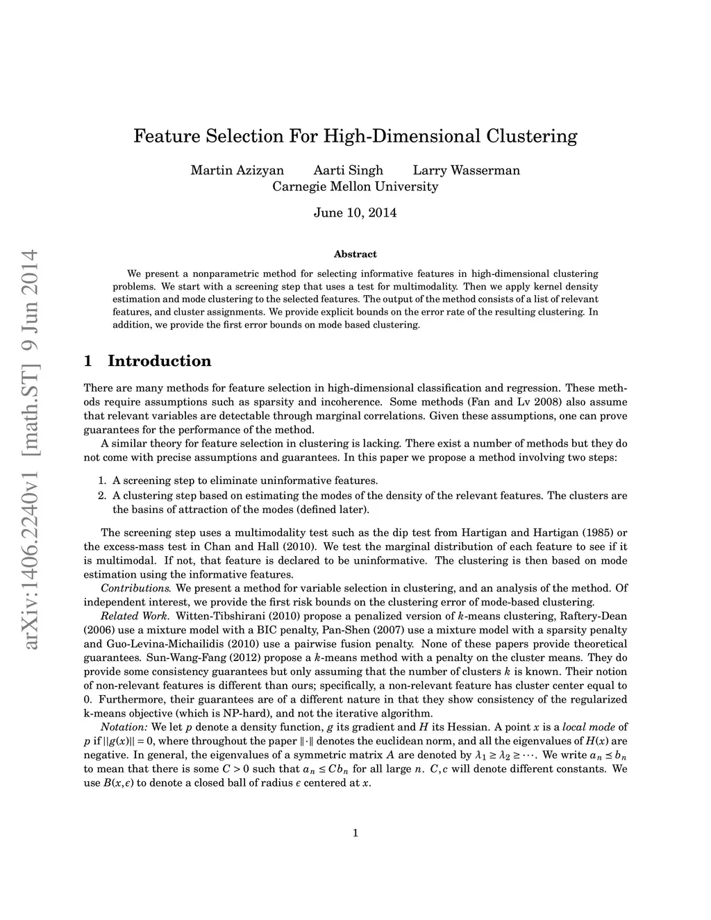 We present a nonparametric method for selecting informative features in high-dimensional clustering problems. We start with a screening step that uses a test for multimodality. Then we apply kernel density estimation and mode clustering to the selected features. The output of the method consists of a list of relevant features, and cluster assignments. We provide explicit bounds on the error rate of the resulting clustering. In addition, we provide the first error bounds on mode based clustering.
