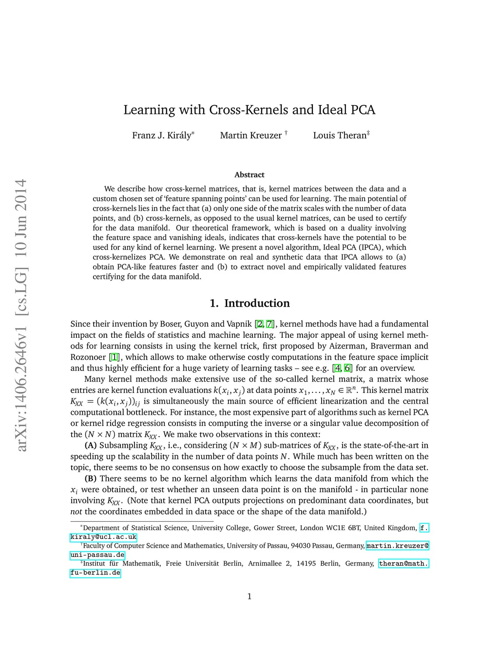 We describe how cross-kernel matrices, that is, kernel matrices between the data and a custom chosen set of `feature spanning points' can be used for learning. The main potential of cross-kernels lies in the fact that (a) only one side of the matrix scales with the number of data points, and (b) cross-kernels, as opposed to the usual kernel matrices, can be used to certify for the data manifold. Our theoretical framework, which is based on a duality involving the feature space and vanishing ideals, indicates that cross-kernels have the potential to be used for any kind of kernel learning. We present a novel algorithm, Ideal PCA (IPCA), which cross-kernelizes PCA. We demonstrate on real and synthetic data that IPCA allows to (a) obtain PCA-like features faster and (b) to extract novel and empirically validated features certifying for the data manifold.