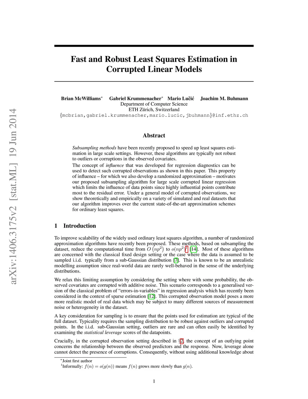 Subsampling methods have been recently proposed to speed up least squares estimation in large scale settings. However, these algorithms are typically not robust to outliers or corruptions in the observed covariates. The concept of influence that was developed for regression diagnostics can be used to detect such corrupted observations as shown in this paper. This property of influence -- for which we also develop a randomized approximation -- motivates our proposed subsampling algorithm for large scale corrupted linear regression which limits the influence of data points since highly influential points contribute most to the residual error. Under a general model of corrupted observations, we show theoretically and empirically on a variety of simulated and real datasets that our algorithm improves over the current state-of-the-art approximation schemes for ordinary least squares.