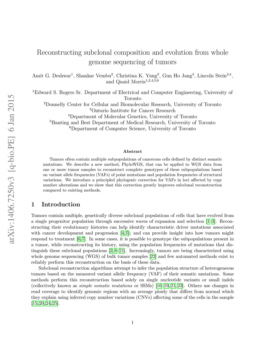 Tumors often contain multiple subpopulations of cancerous cells defined by distinct somatic mutations. We describe a new method, PhyloWGS, that can be applied to WGS data from one or more tumor samples to reconstruct complete genotypes of these subpopulations based on variant allele frequencies (VAFs) of point mutations and population frequencies of structural variations. We introduce a principled phylogenic correction for VAFs in loci affected by copy number alterations and we show that this correction greatly improves subclonal reconstruction compared to existing methods.
