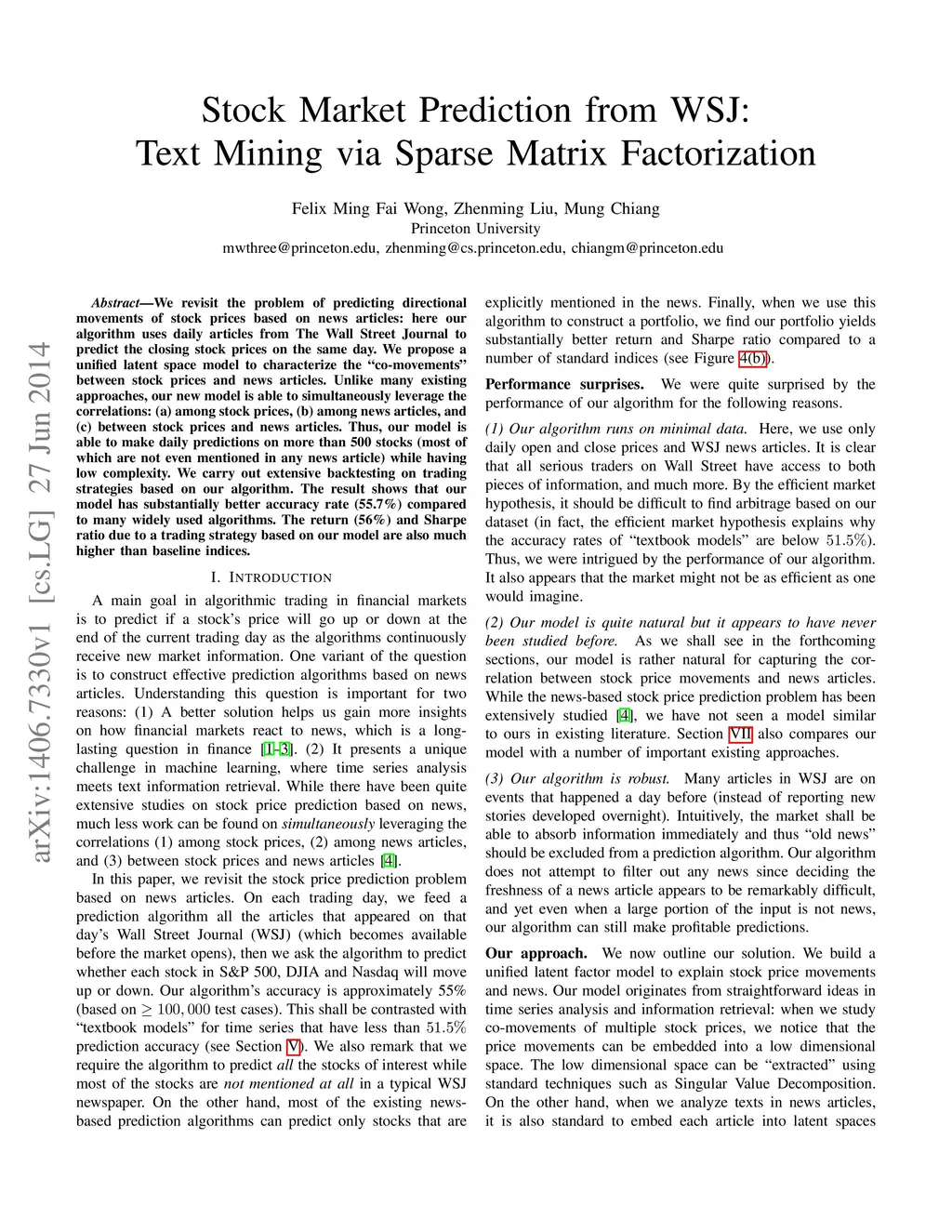 Stock Market Prediction from WSJ: Text Mining via Sparse Matrix