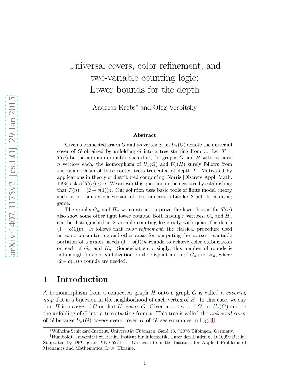 Given a connected graph and its vertex , let denote the universal cover of obtained by unfolding into a tree starting from . Let be the minimum number such that, for graphs and with at most vertices each, the isomorphism of and surely follows from the isomorphism of these rooted trees truncated at depth . Motivated by applications in theory of distributed computing, Norris [Discrete Appl. Math. 1995] asks if . We answer this question in the negative by establishing that . Our solution uses basic tools of finite model theory such as a bisimulation version of the Immerman-Lander 2-pebble counting game. The graphs and we construct to prove the lower bound for also show some other tight lower bounds. Both having vertices, and can be distinguished in 2-variable counting logic only with quantifier depth . It follows that color refinement, the classical procedure used in isomorphism testing and other areas for computing the coarsest equitable partition of a graph, needs rounds to achieve color stabilization on each of and . Somewhat surprisingly, this number of rounds is not enough for color stabilization on the disjoint union of and , where rounds are needed.