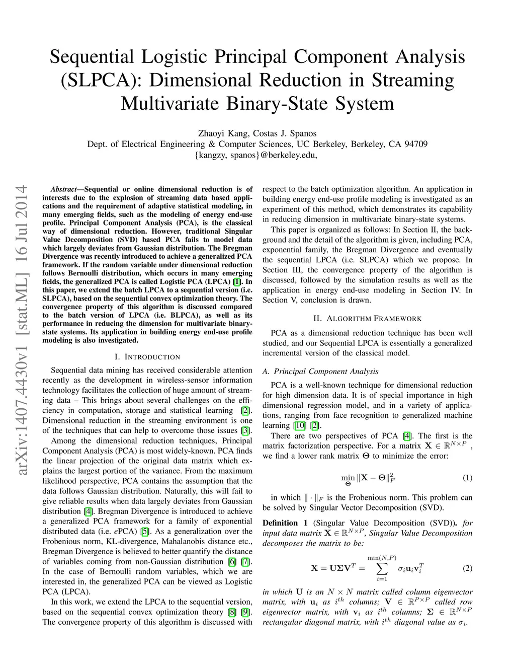 Sequential or online dimensional reduction is of interests due to the explosion of streaming data based applications and the requirement of adaptive statistical modeling, in many emerging fields, such as the modeling of energy end-use profile. Principal Component Analysis (PCA), is the classical way of dimensional reduction. However, traditional Singular Value Decomposition (SVD) based PCA fails to model data which largely deviates from Gaussian distribution. The Bregman Divergence was recently introduced to achieve a generalized PCA framework. If the random variable under dimensional reduction follows Bernoulli distribution, which occurs in many emerging fields, the generalized PCA is called Logistic PCA (LPCA). In this paper, we extend the batch LPCA to a sequential version (i.e. SLPCA), based on the sequential convex optimization theory. The convergence property of this algorithm is discussed compared to the batch version of LPCA (i.e. BLPCA), as well as its performance in reducing the dimension for multivariate binary-state systems. Its application in building energy end-use profile modeling is also investigated.