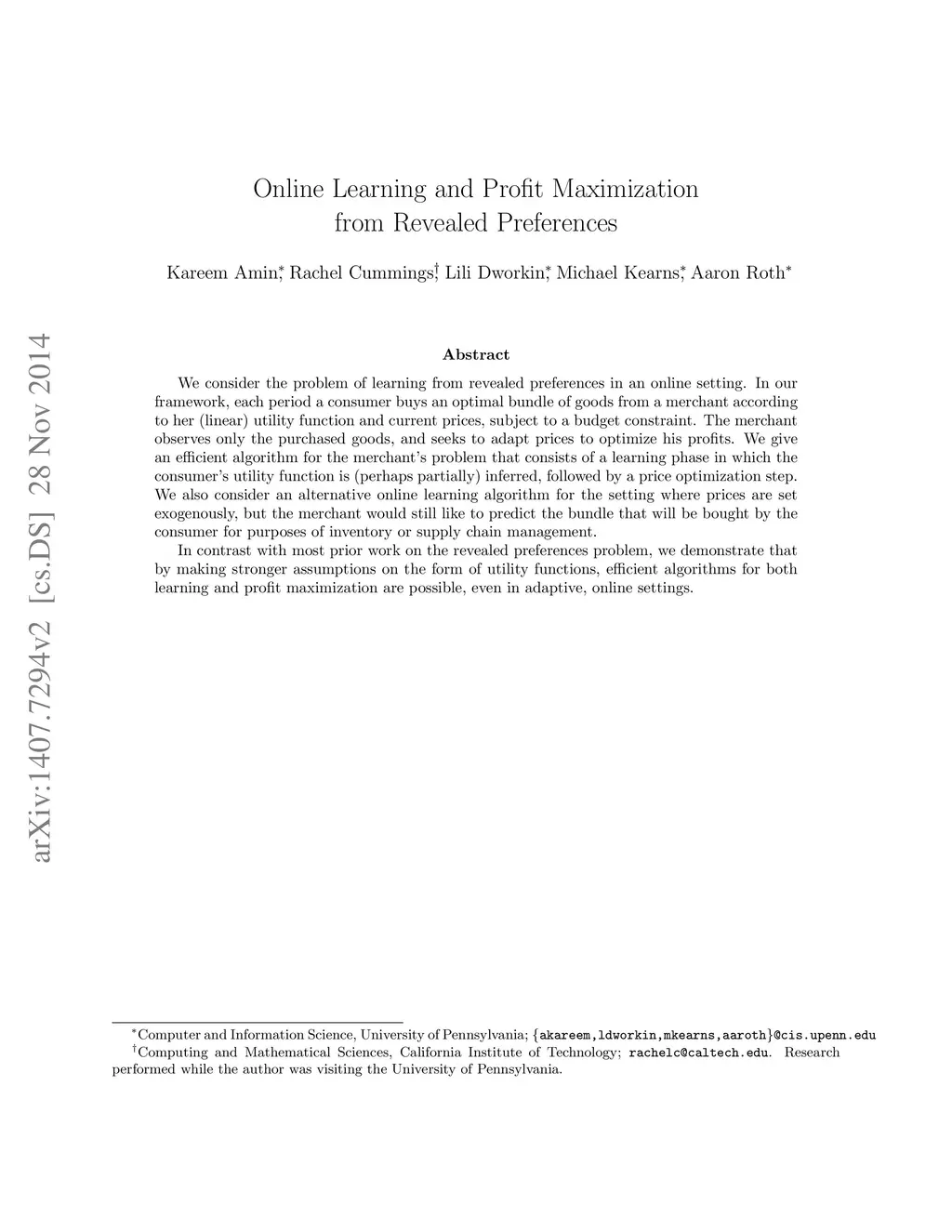 We consider the problem of learning from revealed preferences in an online setting. In our framework, each period a consumer buys an optimal bundle of goods from a merchant according to her (linear) utility function and current prices, subject to a budget constraint. The merchant observes only the purchased goods, and seeks to adapt prices to optimize his profits. We give an efficient algorithm for the merchant's problem that consists of a learning phase in which the consumer's utility function is (perhaps partially) inferred, followed by a price optimization step. We also consider an alternative online learning algorithm for the setting where prices are set exogenously, but the merchant would still like to predict the bundle that will be bought by the consumer for purposes of inventory or supply chain management. In contrast with most prior work on the revealed preferences problem, we demonstrate that by making stronger assumptions on the form of utility functions, efficient algorithms for both learning and profit maximization are possible, even in adaptive, online settings.