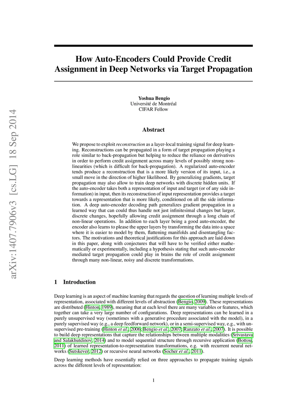 We propose to exploit {\em reconstruction} as a layer-local training signal for deep learning. Reconstructions can be propagated in a form of target propagation playing a role similar to back-propagation but helping to reduce the reliance on derivatives in order to perform credit assignment across many levels of possibly strong non-linearities (which is difficult for back-propagation). A regularized auto-encoder tends produce a reconstruction that is a more likely version of its input, i.e., a small move in the direction of higher likelihood. By generalizing gradients, target propagation may also allow to train deep networks with discrete hidden units. If the auto-encoder takes both a representation of input and target (or of any side information) in input, then its reconstruction of input representation provides a target towards a representation that is more likely, conditioned on all the side information. A deep auto-encoder decoding path generalizes gradient propagation in a learned way that can could thus handle not just infinitesimal changes but larger, discrete changes, hopefully allowing credit assignment through a long chain of non-linear operations. In addition to each layer being a good auto-encoder, the encoder also learns to please the upper layers by transforming the data into a space where it is easier to model by them, flattening manifolds and disentangling factors. The motivations and theoretical justifications for this approach are laid down in this paper, along with conjectures that will have to be verified either mathematically or experimentally, including a hypothesis stating that such auto-encoder mediated target propagation could play in brains the role of credit assignment through many non-linear, noisy and discrete transformations.