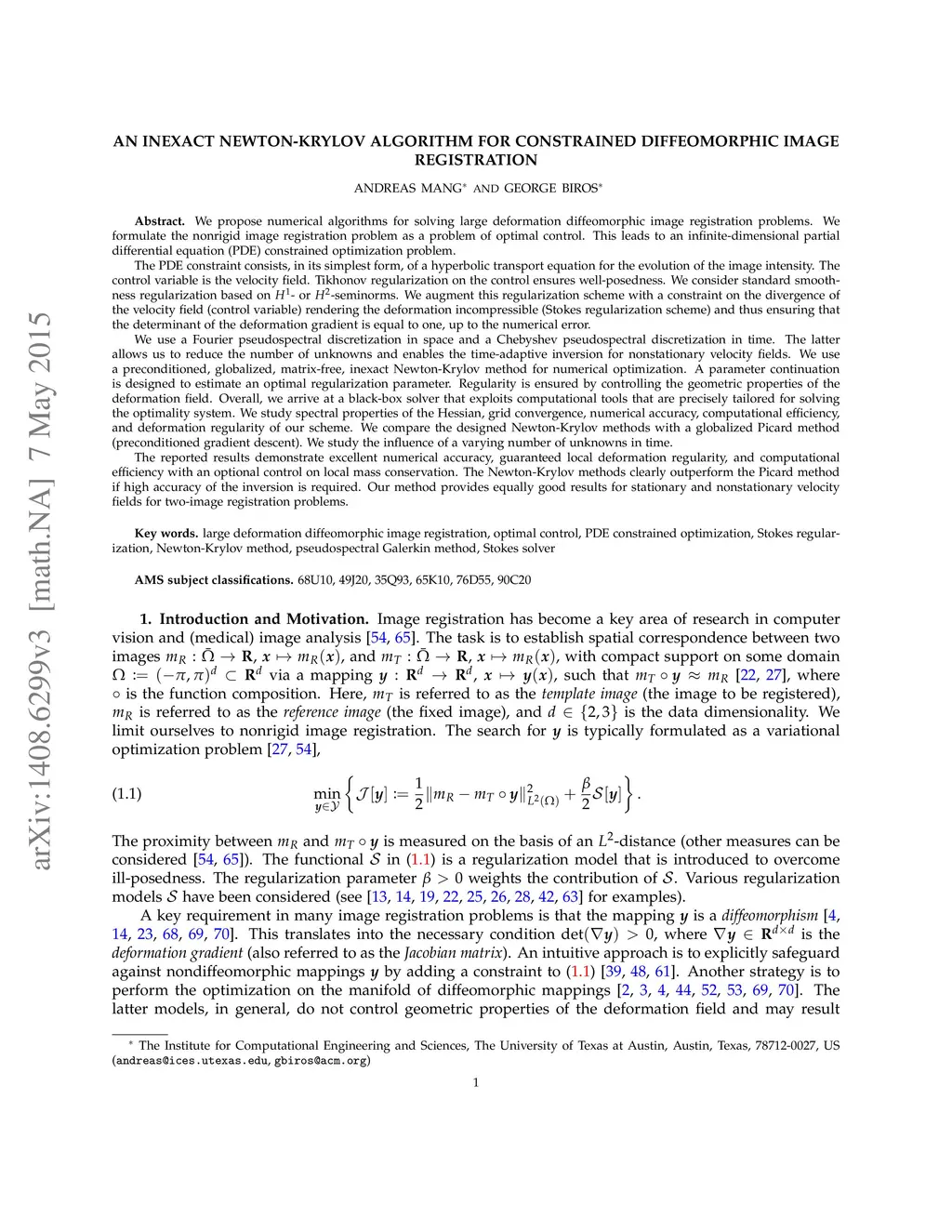 We propose numerical algorithms for solving large deformation diffeomorphic image registration problems. We formulate the nonrigid image registration problem as a problem of optimal control. This leads to an infinite-dimensional partial differential equation (PDE) constrained optimization problem. The PDE constraint consists, in its simplest form, of a hyperbolic transport equation for the evolution of the image intensity. The control variable is the velocity field. Tikhonov regularization on the control ensures well-posedness. We consider standard smoothness regularization based on - or -seminorms. We augment this regularization scheme with a constraint on the divergence of the velocity field rendering the deformation incompressible and thus ensuring that the determinant of the deformation gradient is equal to one, up to the numerical error. We use a Fourier pseudospectral discretization in space and a Chebyshev pseudospectral discretization in time. We use a preconditioned, globalized, matrix-free, inexact Newton-Krylov method for numerical optimization. A parameter continuation is designed to estimate an optimal regularization parameter. Regularity is ensured by controlling the geometric properties of the deformation field. Overall, we arrive at a black-box solver. We study spectral properties of the Hessian, grid convergence, numerical accuracy, computational efficiency, and deformation regularity of our scheme. We compare the designed Newton-Krylov methods with a globalized preconditioned gradient descent. We study the influence of a varying number of unknowns in time. The reported results demonstrate excellent numerical accuracy, guaranteed local deformation regularity, and computational efficiency with an optional control on local mass conservation. The Newton-Krylov methods clearly outperform the Picard method if high accuracy of the inversion is required.