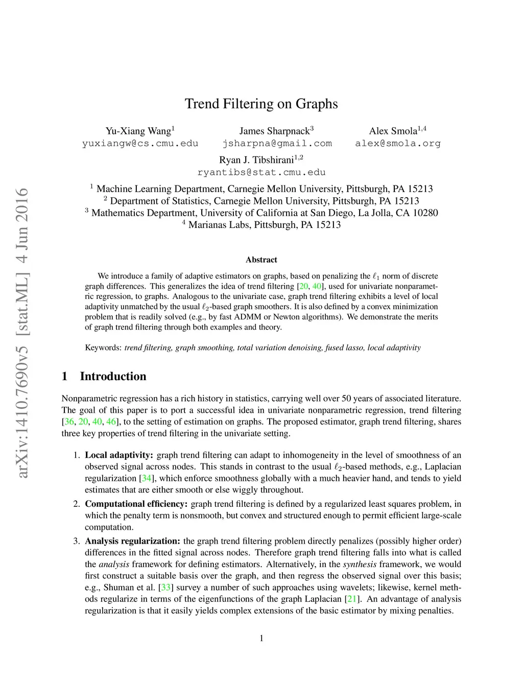 We introduce a family of adaptive estimators on graphs, based on penalizing the norm of discrete graph differences. This generalizes the idea of trend filtering [Kim et al. (2009), Tibshirani (2014)], used for univariate nonparametric regression, to graphs. Analogous to the univariate case, graph trend filtering exhibits a level of local adaptivity unmatched by the usual -based graph smoothers. It is also defined by a convex minimization problem that is readily solved (e.g., by fast ADMM or Newton algorithms). We demonstrate the merits of graph trend filtering through examples and theory.