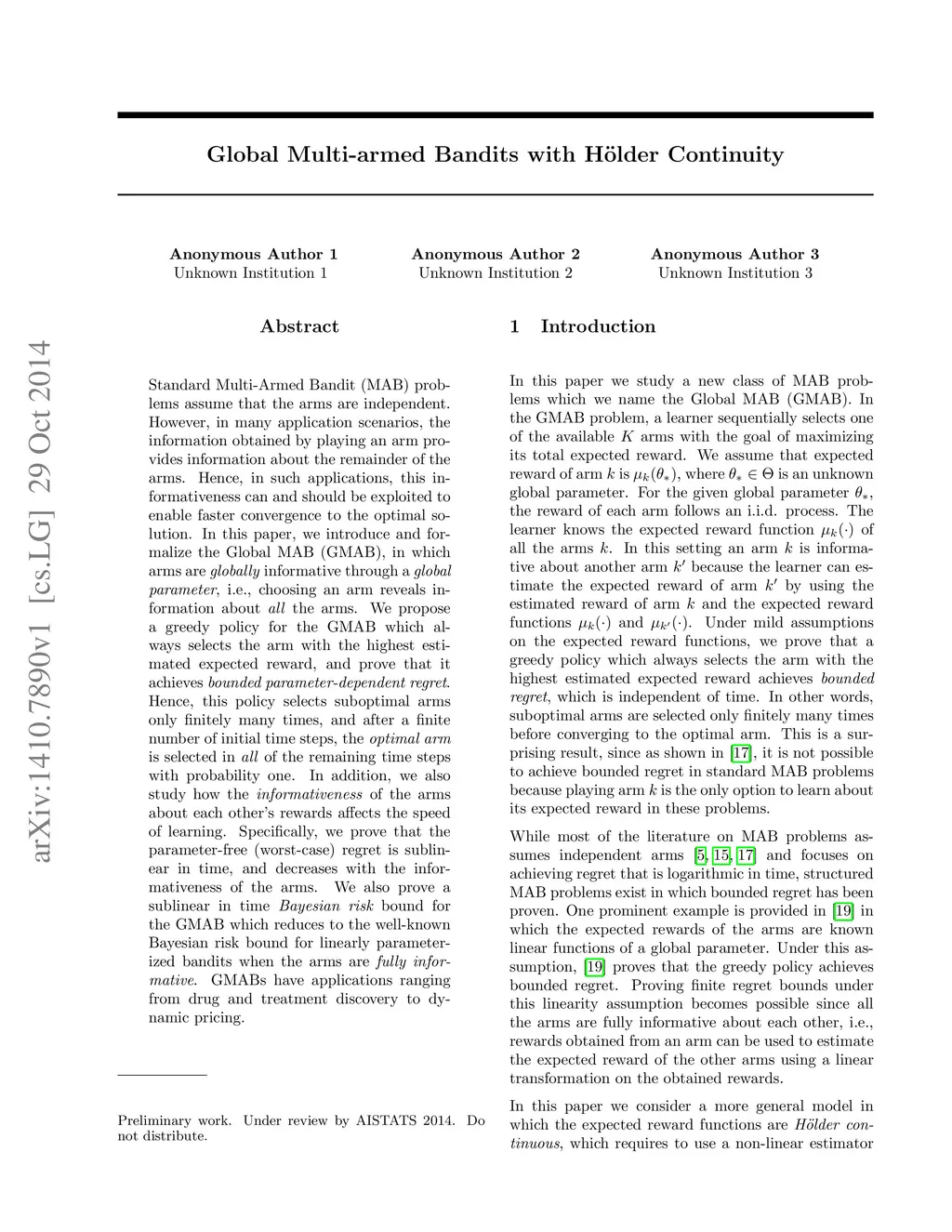 Standard Multi-Armed Bandit (MAB) problems assume that the arms are independent. However, in many application scenarios, the information obtained by playing an arm provides information about the remainder of the arms. Hence, in such applications, this informativeness can and should be exploited to enable faster convergence to the optimal solution. In this paper, we introduce and formalize the Global MAB (GMAB), in which arms are globally informative through a global parameter, i.e., choosing an arm reveals information about all the arms. We propose a greedy policy for the GMAB which always selects the arm with the highest estimated expected reward, and prove that it achieves bounded parameter-dependent regret. Hence, this policy selects suboptimal arms only finitely many times, and after a finite number of initial time steps, the optimal arm is selected in all of the remaining time steps with probability one. In addition, we also study how the informativeness of the arms about each other's rewards affects the speed of learning. Specifically, we prove that the parameter-free (worst-case) regret is sublinear in time, and decreases with the informativeness of the arms. We also prove a sublinear in time Bayesian risk bound for the GMAB which reduces to the well-known Bayesian risk bound for linearly parameterized bandits when the arms are fully informative. GMABs have applications ranging from drug and treatment discovery to dynamic pricing.