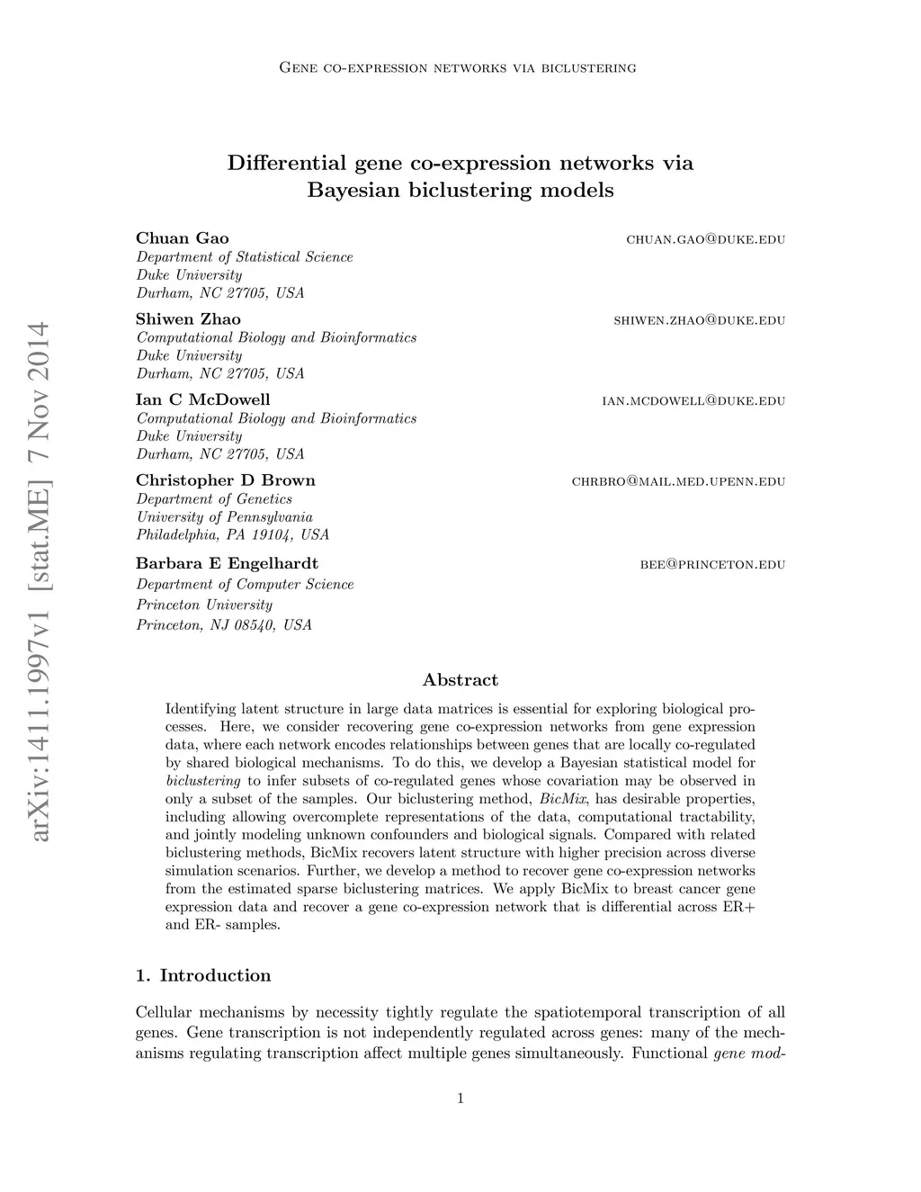 Identifying latent structure in large data matrices is essential for exploring biological processes. Here, we consider recovering gene co-expression networks from gene expression data, where each network encodes relationships between genes that are locally co-regulated by shared biological mechanisms. To do this, we develop a Bayesian statistical model for biclustering to infer subsets of co-regulated genes whose covariation may be observed in only a subset of the samples. Our biclustering method, BicMix, has desirable properties, including allowing overcomplete representations of the data, computational tractability, and jointly modeling unknown confounders and biological signals. Compared with related biclustering methods, BicMix recovers latent structure with higher precision across diverse simulation scenarios. Further, we develop a method to recover gene co-expression networks from the estimated sparse biclustering matrices. We apply BicMix to breast cancer gene expression data and recover a gene co-expression network that is differential across ER+ and ER- samples.