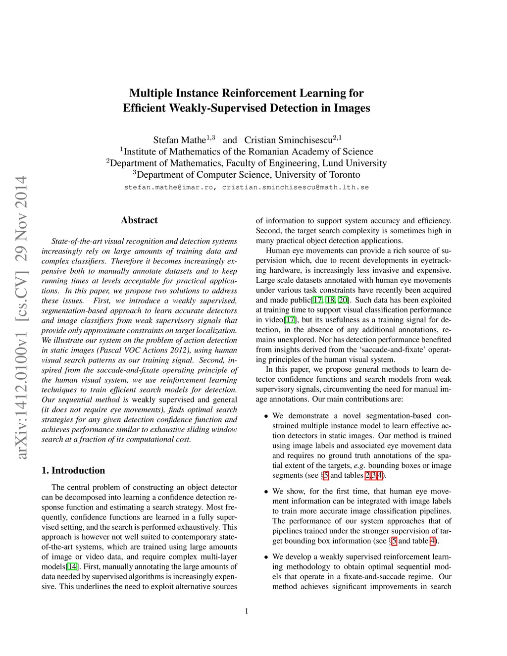 State-of-the-art visual recognition and detection systems increasingly rely on large amounts of training data and complex classifiers. Therefore it becomes increasingly expensive both to manually annotate datasets and to keep running times at levels acceptable for practical applications. In this paper, we propose two solutions to address these issues. First, we introduce a weakly supervised, segmentation-based approach to learn accurate detectors and image classifiers from weak supervisory signals that provide only approximate constraints on target localization. We illustrate our system on the problem of action detection in static images (Pascal VOC Actions 2012), using human visual search patterns as our training signal. Second, inspired from the saccade-and-fixate operating principle of the human visual system, we use reinforcement learning techniques to train efficient search models for detection. Our sequential method is weakly supervised and general (it does not require eye movements), finds optimal search strategies for any given detection confidence function and achieves performance similar to exhaustive sliding window search at a fraction of its computational cost.