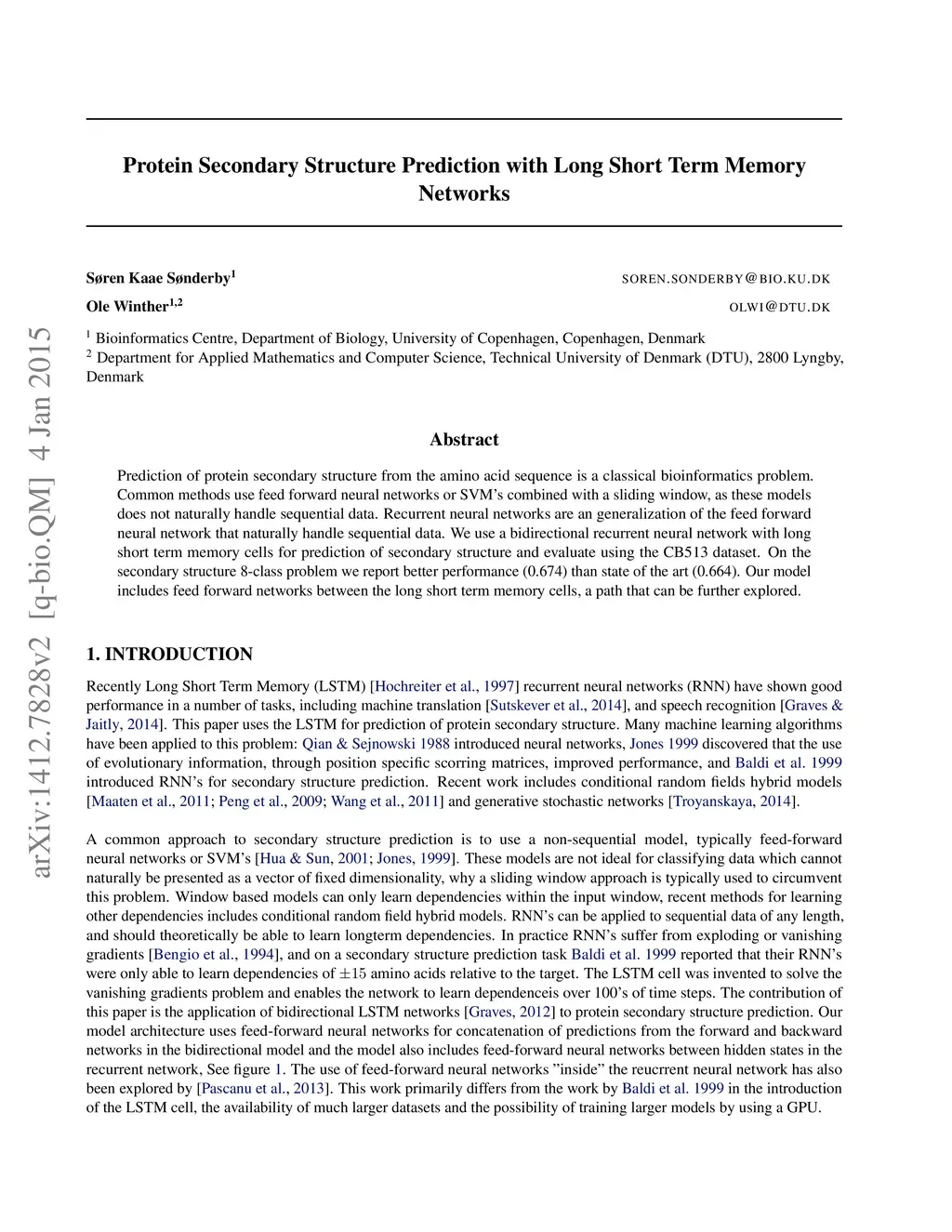 Protein Secondary Structure Prediction with Long Short Term Memory