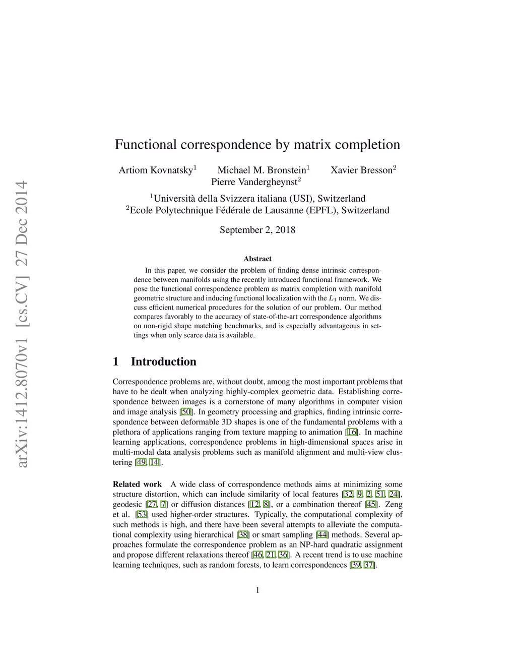 In this paper, we consider the problem of finding dense intrinsic correspondence between manifolds using the recently introduced functional framework. We pose the functional correspondence problem as matrix completion with manifold geometric structure and inducing functional localization with the norm. We discuss efficient numerical procedures for the solution of our problem. Our method compares favorably to the accuracy of state-of-the-art correspondence algorithms on non-rigid shape matching benchmarks, and is especially advantageous in settings when only scarce data is available.