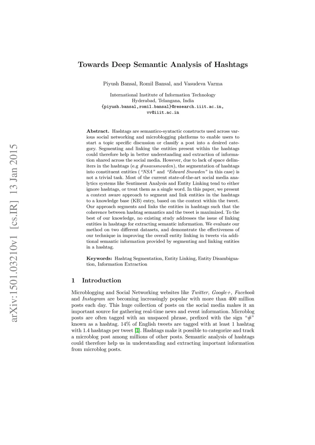 Hashtags are semantico-syntactic constructs used across various social networking and microblogging platforms to enable users to start a topic specific discussion or classify a post into a desired category. Segmenting and linking the entities present within the hashtags could therefore help in better understanding and extraction of information shared across the social media. However, due to lack of space delimiters in the hashtags (e.g #nsavssnowden), the segmentation of hashtags into constituent entities ("NSA" and "Edward Snowden" in this case) is not a trivial task. Most of the current state-of-the-art social media analytics systems like Sentiment Analysis and Entity Linking tend to either ignore hashtags, or treat them as a single word. In this paper, we present a context aware approach to segment and link entities in the hashtags to a knowledge base (KB) entry, based on the context within the tweet. Our approach segments and links the entities in hashtags such that the coherence between hashtag semantics and the tweet is maximized. To the best of our knowledge, no existing study addresses the issue of linking entities in hashtags for extracting semantic information. We evaluate our method on two different datasets, and demonstrate the effectiveness of our technique in improving the overall entity linking in tweets via additional semantic information provided by segmenting and linking entities in a hashtag.