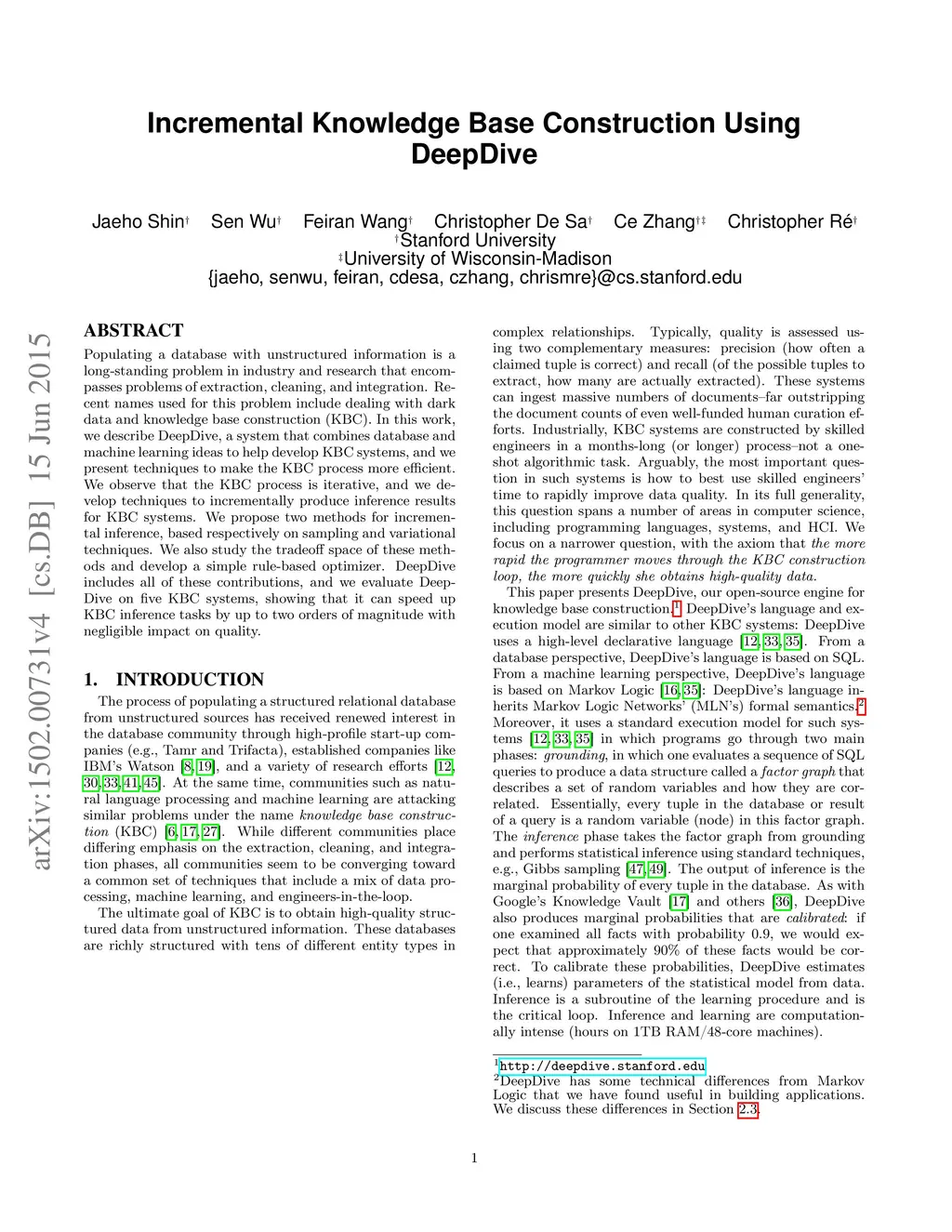 Populating a database with unstructured information is a long-standing problem in industry and research that encompasses problems of extraction, cleaning, and integration. Recent names used for this problem include dealing with dark data and knowledge base construction (KBC). In this work, we describe DeepDive, a system that combines database and machine learning ideas to help develop KBC systems, and we present techniques to make the KBC process more efficient. We observe that the KBC process is iterative, and we develop techniques to incrementally produce inference results for KBC systems. We propose two methods for incremental inference, based respectively on sampling and variational techniques. We also study the tradeoff space of these methods and develop a simple rule-based optimizer. DeepDive includes all of these contributions, and we evaluate DeepDive on five KBC systems, showing that it can speed up KBC inference tasks by up to two orders of magnitude with negligible impact on quality.