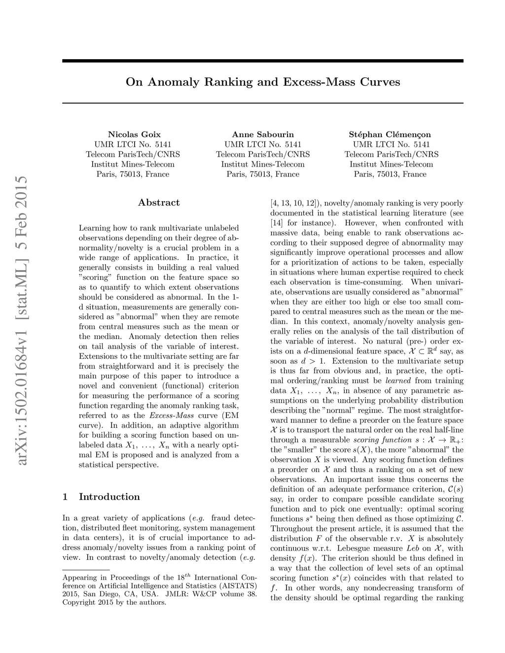 Learning how to rank multivariate unlabeled observations depending on their degree of abnormality/novelty is a crucial problem in a wide range of applications. In practice, it generally consists in building a real valued "scoring" function on the feature space so as to quantify to which extent observations should be considered as abnormal. In the 1-d situation, measurements are generally considered as "abnormal" when they are remote from central measures such as the mean or the median. Anomaly detection then relies on tail analysis of the variable of interest. Extensions to the multivariate setting are far from straightforward and it is precisely the main purpose of this paper to introduce a novel and convenient (functional) criterion for measuring the performance of a scoring function regarding the anomaly ranking task, referred to as the Excess-Mass curve (EM curve). In addition, an adaptive algorithm for building a scoring function based on unlabeled data X1 , . . . , Xn with a nearly optimal EM is proposed and is analyzed from a statistical perspective.