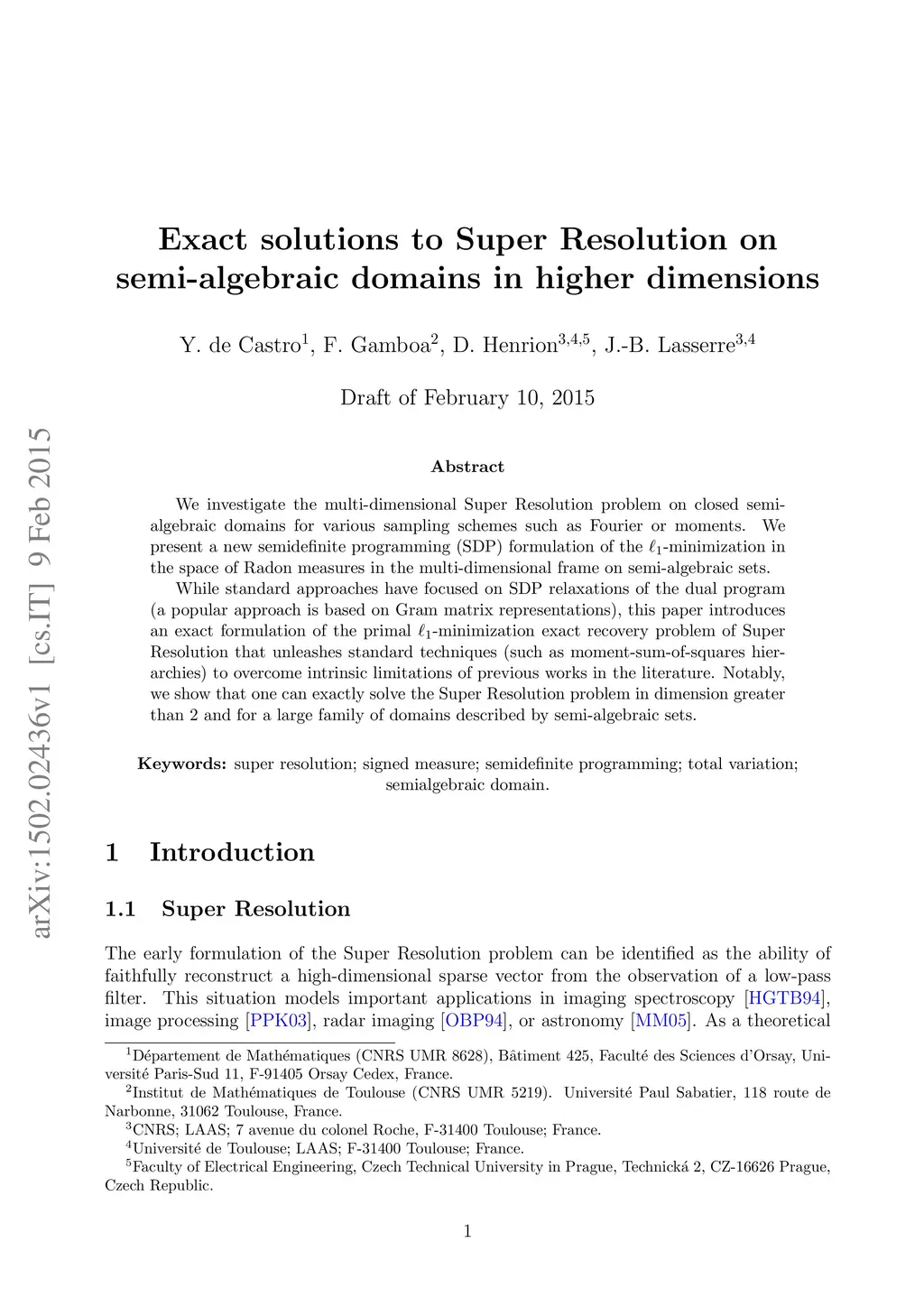 We investigate the multi-dimensional Super Resolution problem on closed semi-algebraic domains for various sampling schemes such as Fourier or moments. We present a new semidefinite programming (SDP) formulation of the 1 -minimization in the space of Radon measures in the multi-dimensional frame on semi-algebraic sets. While standard approaches have focused on SDP relaxations of the dual program (a popular approach is based on Gram matrix representations), this paper introduces an exact formulation of the primal 1 -minimization exact recovery problem of Super Resolution that unleashes standard techniques (such as moment-sum-of-squares hier-archies) to overcome intrinsic limitations of previous works in the literature. Notably, we show that one can exactly solve the Super Resolution problem in dimension greater than 2 and for a large family of domains described by semi-algebraic sets.