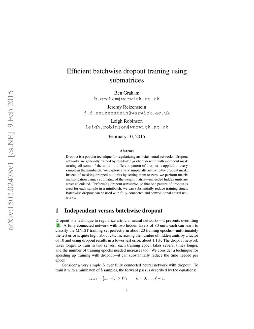 Efficient batchwise dropout training using submatrices