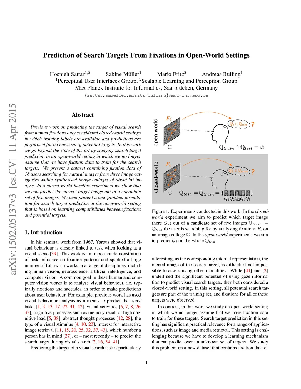 Previous work on predicting the target of visual search from human fixations only considered closed-world settings in which training labels are available and predictions are performed for a known set of potential targets. In this work we go beyond the state of the art by studying search target prediction in an open-world setting in which we no longer assume that we have fixation data to train for the search targets. We present a dataset containing fixation data of 18 users searching for natural images from three image categories within synthesised image collages of about 80 images. In a closed-world baseline experiment we show that we can predict the correct target image out of a candidate set of five images. We then present a new problem formulation for search target prediction in the open-world setting that is based on learning compatibilities between fixations and potential targets.