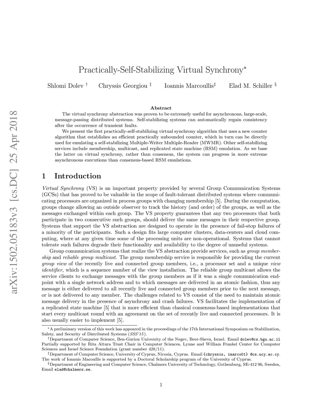 Virtual synchrony is an important abstraction that is proven to be extremely useful when implemented over asynchronous, typically large, message-passing distributed systems. Fault tolerant design is a key criterion for the success of such implementations. This is because large distributed systems can be highly available as long as they do not depend on the full operational status of every system participant. Namely, they employ redundancy in numbers to overcome non-optimal behavior of participants and to gain global robustness and high availability. Self-stabilizing systems can tolerate transient faults that drive the system to an arbitrary unpredicted configuration. Such systems automatically regain consistency from any such arbitrary configuration, and then produce the desired system behavior. Practically self-stabilizing systems ensure the desired system behavior for practically infinite number of successive steps e.g., steps. We present the first practically self-stabilizing virtual synchrony algorithm. The algorithm is a combination of several new techniques that may be of independent interest. In particular, we present a new counter algorithm that establishes an efficient practically unbounded counter, that in turn can be directly used to implement a self-stabilizing Multiple-Writer Multiple-Reader (MWMR) register emulation. Other components include self-stabilizing group membership, self-stabilizing multicast, and self-stabilizing emulation of replicated state machine. As we base the replicated state machine implementation on virtual synchrony, rather than consensus, the system progresses in more extreme asynchronous executions in relation to consensus-based replicated state machine.