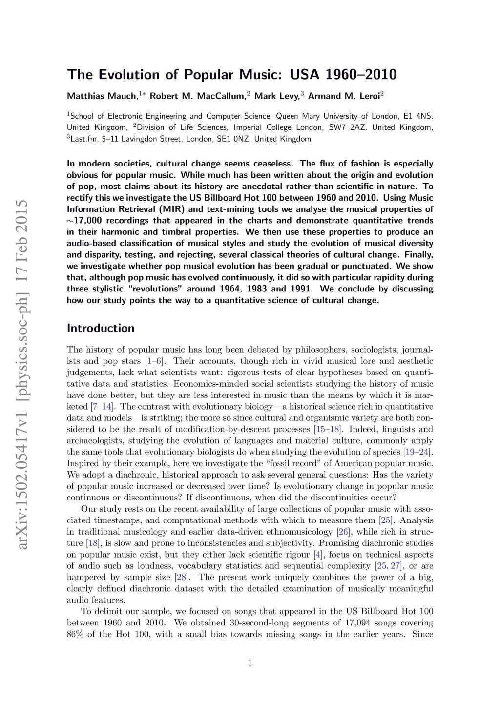In modern societies, cultural change seems ceaseless. The flux of fashion is especially obvious for popular music. While much has been written about the origin and evolution of pop, most claims about its history are anecdotal rather than scientific in nature. To rectify this we investigate the US Billboard Hot 100 between 1960 and 2010. Using Music Information Retrieval (MIR) and text-mining tools we analyse the musical properties of ~17,000 recordings that appeared in the charts and demonstrate quantitative trends in their harmonic and timbral properties. We then use these properties to produce an audio-based classification of musical styles and study the evolution of musical diversity and disparity, testing, and rejecting, several classical theories of cultural change. Finally, we investigate whether pop musical evolution has been gradual or punctuated. We show that, although pop music has evolved continuously, it did so with particular rapidity during three stylistic "revolutions" around 1964, 1983 and 1991. We conclude by discussing how our study points the way to a quantitative science of cultural change.