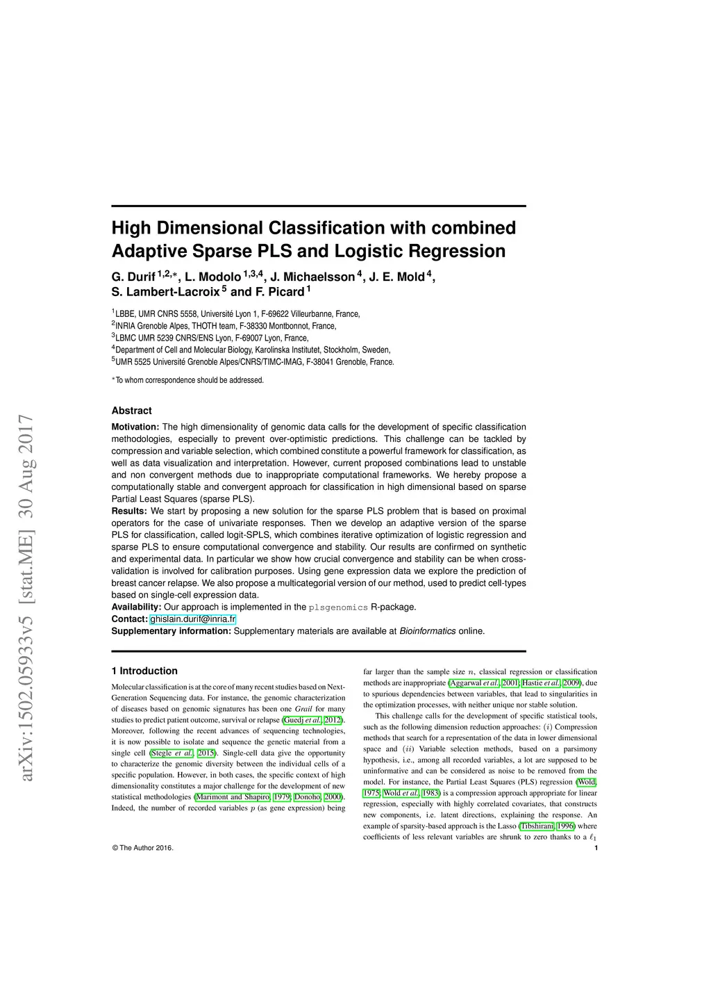 Motivation: The high dimensionality of genomic data calls for the development of specific classification methodologies, especially to prevent over-optimistic predictions. This challenge can be tackled by compression and variable selection, which combined constitute a powerful framework for classification, as well as data visualization and interpretation. However, current proposed combinations lead to instable and non convergent methods due to inappropriate computational frameworks. We hereby propose a stable and convergent approach for classification in high dimensional based on sparse Partial Least Squares (sparse PLS). Results: We start by proposing a new solution for the sparse PLS problem that is based on proximal operators for the case of univariate responses. Then we develop an adaptive version of the sparse PLS for classification, which combines iterative optimization of logistic regression and sparse PLS to ensure convergence and stability. Our results are confirmed on synthetic and experimental data. In particular we show how crucial convergence and stability can be when cross-validation is involved for calibration purposes. Using gene expression data we explore the prediction of breast cancer relapse. We also propose a multicategorial version of our method on the prediction of cell-types based on single-cell expression data. Availability: Our approach is implemented in the plsgenomics R-package.