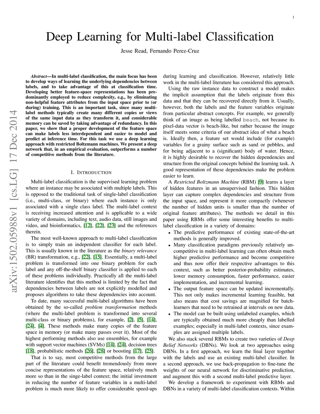 In multi-label classification, the main focus has been to develop ways of learning the underlying dependencies between labels, and to take advantage of this at classification time. Developing better feature-space representations has been predominantly employed to reduce complexity, e.g., by eliminating non-helpful feature attributes from the input space prior to (or during) training. This is an important task, since many multi-label methods typically create many different copies or views of the same input data as they transform it, and considerable memory can be saved by taking advantage of redundancy. In this paper, we show that a proper development of the feature space can make labels less interdependent and easier to model and predict at inference time. For this task we use a deep learning approach with restricted Boltzmann machines. We present a deep network that, in an empirical evaluation, outperforms a number of competitive methods from the literature