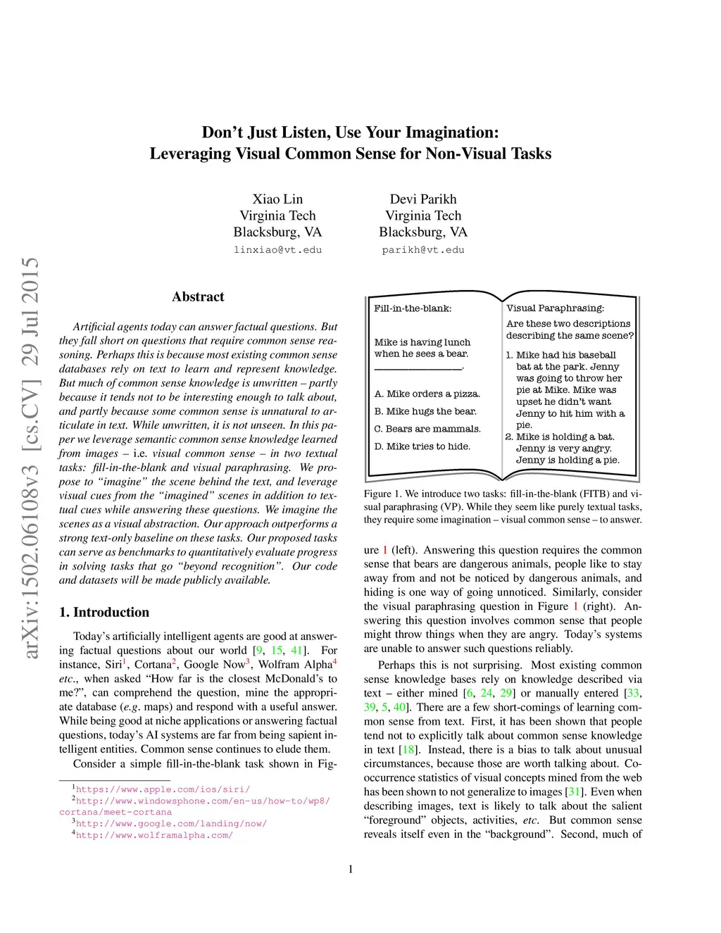 Artificial agents today can answer factual questions. But they fall short on questions that require common sense reasoning. Perhaps this is because most existing common sense databases rely on text to learn and represent knowledge. But much of common sense knowledge is unwritten - partly because it tends not to be interesting enough to talk about, and partly because some common sense is unnatural to articulate in text. While unwritten, it is not unseen. In this paper we leverage semantic common sense knowledge learned from images - i.e. visual common sense - in two textual tasks: fill-in-the-blank and visual paraphrasing. We propose to "imagine" the scene behind the text, and leverage visual cues from the "imagined" scenes in addition to textual cues while answering these questions. We imagine the scenes as a visual abstraction. Our approach outperforms a strong text-only baseline on these tasks. Our proposed tasks can serve as benchmarks to quantitatively evaluate progress in solving tasks that go "beyond recognition". Our code and datasets are publicly available.
