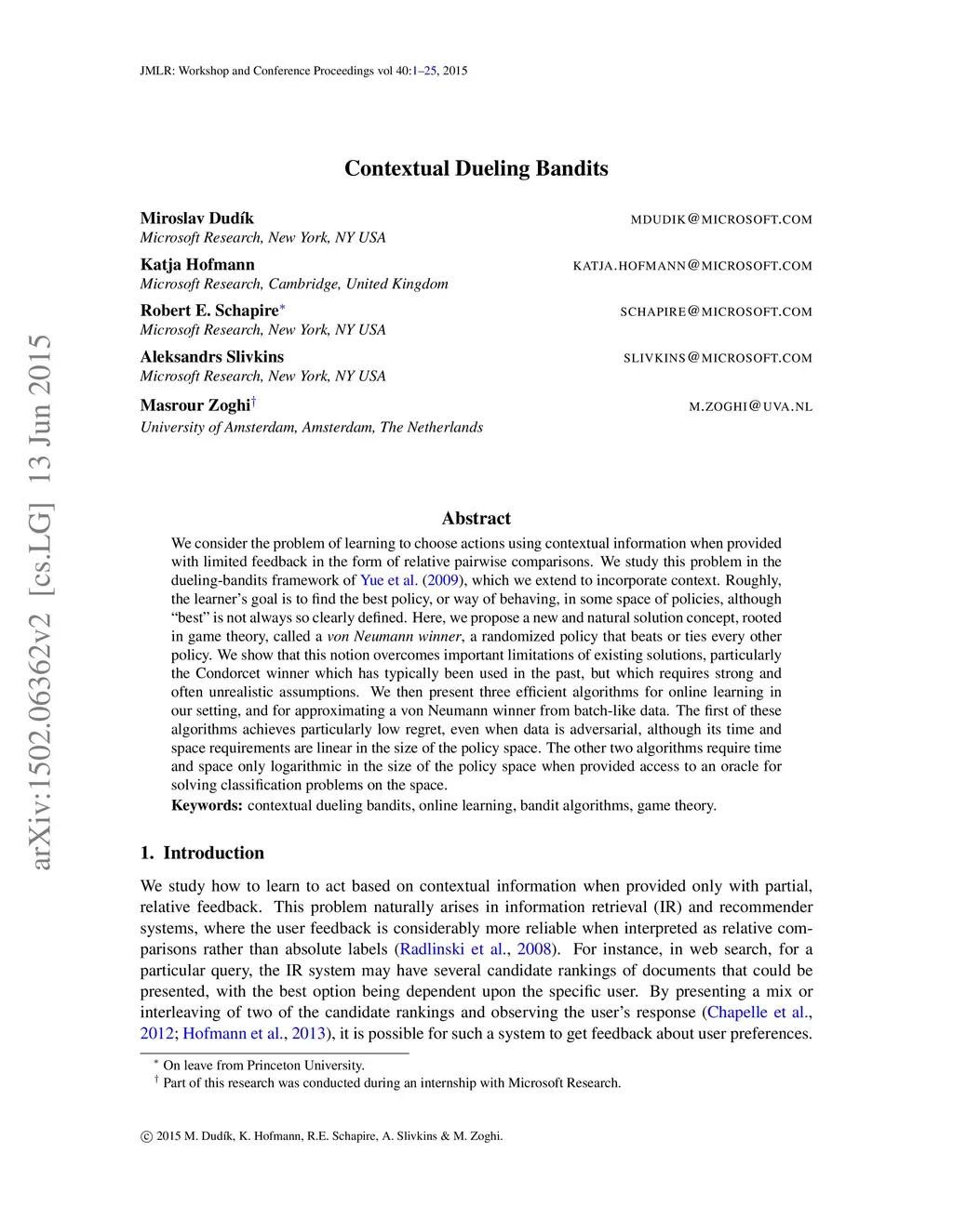 We consider the problem of learning to choose actions using contextual information when provided with limited feedback in the form of relative pairwise comparisons. We study this problem in the dueling-bandits framework of Yue et al. (2009), which we extend to incorporate context. Roughly, the learner's goal is to find the best policy, or way of behaving, in some space of policies, although "best" is not always so clearly defined. Here, we propose a new and natural solution concept, rooted in game theory, called a von Neumann winner, a randomized policy that beats or ties every other policy. We show that this notion overcomes important limitations of existing solutions, particularly the Condorcet winner which has typically been used in the past, but which requires strong and often unrealistic assumptions. We then present three efficient algorithms for online learning in our setting, and for approximating a von Neumann winner from batch-like data. The first of these algorithms achieves particularly low regret, even when data is adversarial, although its time and space requirements are linear in the size of the policy space. The other two algorithms require time and space only logarithmic in the size of the policy space when provided access to an oracle for solving classification problems on the space.