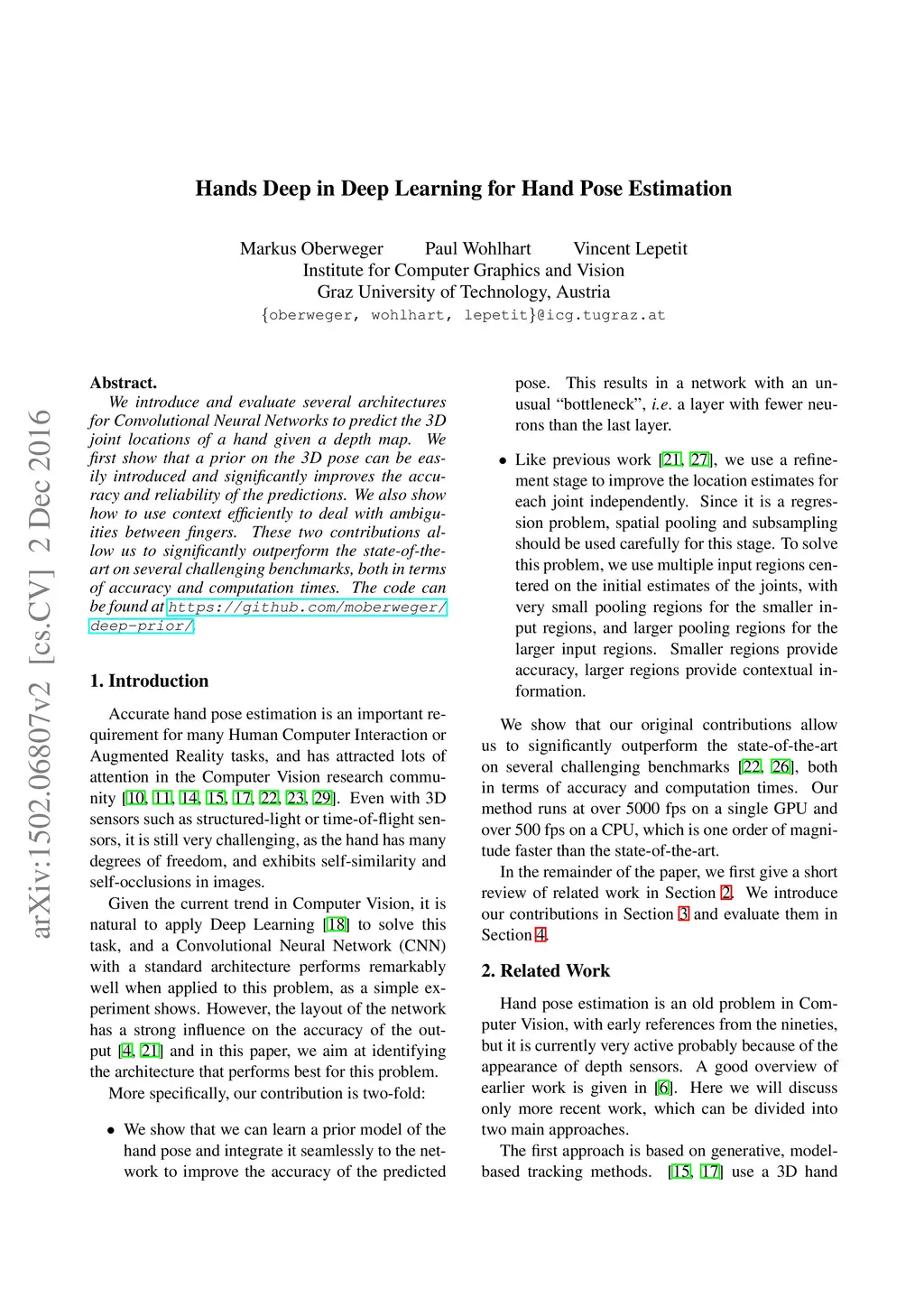 We introduce and evaluate several architectures for Convolutional Neural Networks to predict the 3D joint locations of a hand given a depth map. We first show that a prior on the 3D pose can be easily introduced and significantly improves the accuracy and reliability of the predictions. We also show how to use context efficiently to deal with ambiguities between fingers. These two contributions allow us to significantly outperform the state-of-the-art on several challenging benchmarks, both in terms of accuracy and computation times.