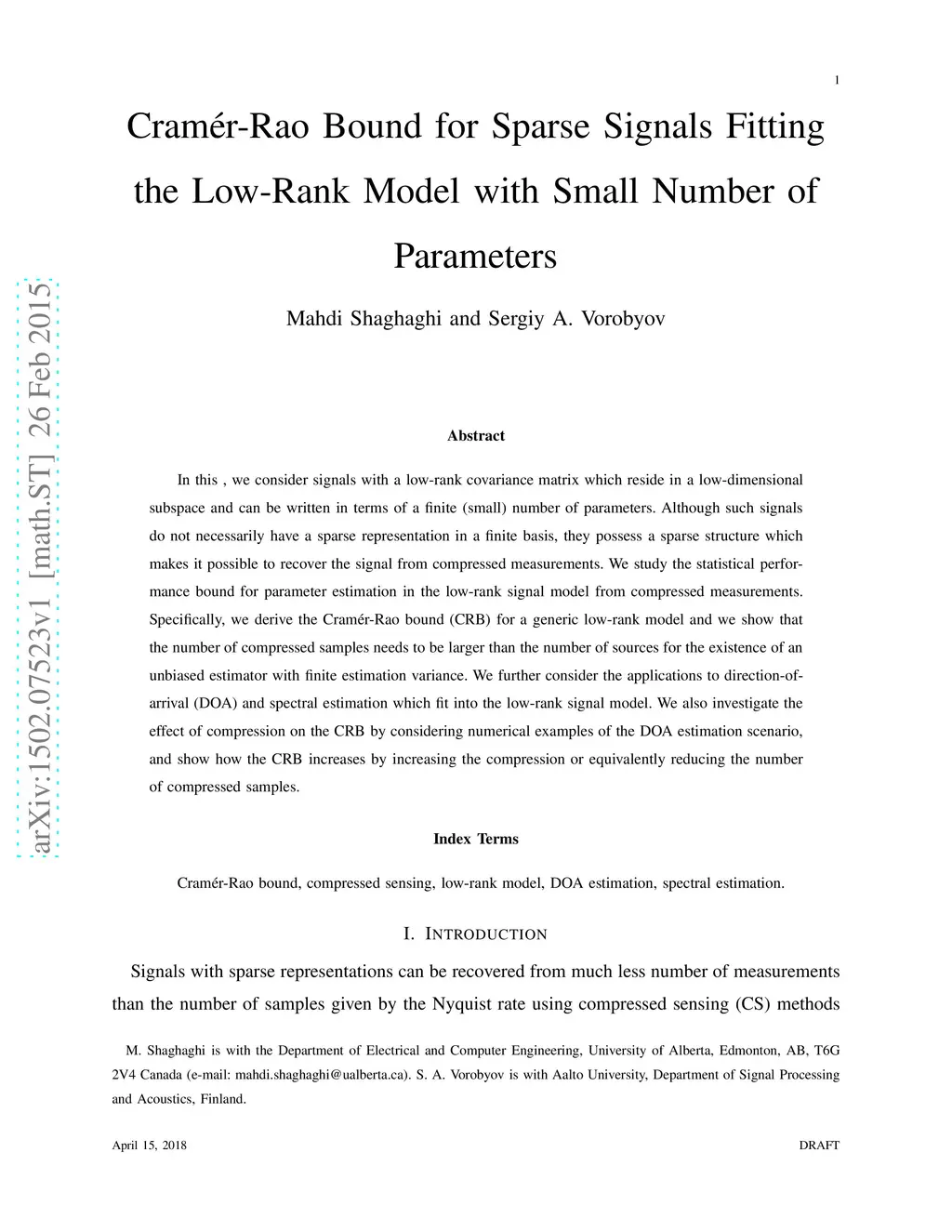 In this paper, we consider signals with a low-rank covariance matrix which reside in a low-dimensional subspace and can be written in terms of a finite (small) number of parameters. Although such signals do not necessarily have a sparse representation in a finite basis, they possess a sparse structure which makes it possible to recover the signal from compressed measurements. We study the statistical performance bound for parameter estimation in the low-rank signal model from compressed measurements. Specifically, we derive the Cramer-Rao bound (CRB) for a generic low-rank model and we show that the number of compressed samples needs to be larger than the number of sources for the existence of an unbiased estimator with finite estimation variance. We further consider the applications to direction-of-arrival (DOA) and spectral estimation which fit into the low-rank signal model. We also investigate the effect of compression on the CRB by considering numerical examples of the DOA estimation scenario, and show how the CRB increases by increasing the compression or equivalently reducing the number of compressed samples.