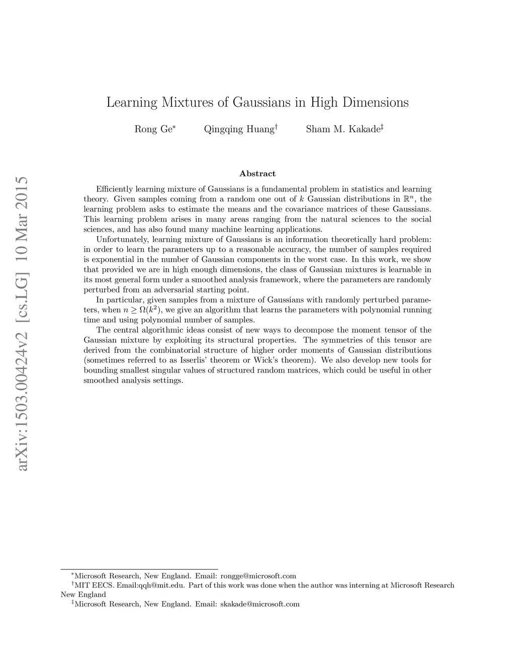 Efficiently learning mixture of Gaussians is a fundamental problem in statistics and learning theory. Given samples coming from a random one out of k Gaussian distributions in Rn, the learning problem asks to estimate the means and the covariance matrices of these Gaussians. This learning problem arises in many areas ranging from the natural sciences to the social sciences, and has also found many machine learning applications. Unfortunately, learning mixture of Gaussians is an information theoretically hard problem: in order to learn the parameters up to a reasonable accuracy, the number of samples required is exponential in the number of Gaussian components in the worst case. In this work, we show that provided we are in high enough dimensions, the class of Gaussian mixtures is learnable in its most general form under a smoothed analysis framework, where the parameters are randomly perturbed from an adversarial starting point. In particular, given samples from a mixture of Gaussians with randomly perturbed parameters, when n > {\Omega}(k^2), we give an algorithm that learns the parameters with polynomial running time and using polynomial number of samples. The central algorithmic ideas consist of new ways to decompose the moment tensor of the Gaussian mixture by exploiting its structural properties. The symmetries of this tensor are derived from the combinatorial structure of higher order moments of Gaussian distributions (sometimes referred to as Isserlis' theorem or Wick's theorem). We also develop new tools for bounding smallest singular values of structured random matrices, which could be useful in other smoothed analysis settings.