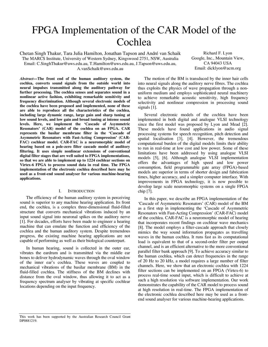 FPGA Implementation of the CAR Model of the Cochlea