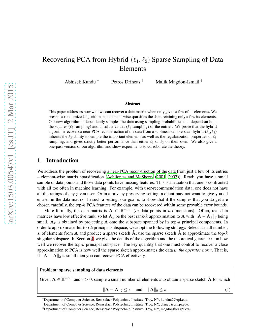 This paper addresses how well we can recover a data matrix when only given a few of its elements. We present a randomized algorithm that element-wise sparsifies the data, retaining only a few its elements. Our new algorithm independently samples the data using sampling probabilities that depend on both the squares ( sampling) and absolute values ( sampling) of the entries. We prove that the hybrid algorithm recovers a near-PCA reconstruction of the data from a sublinear sample-size: hybrid-() inherits the -ability to sample the important elements as well as the regularization properties of sampling, and gives strictly better performance than either or on their own. We also give a one-pass version of our algorithm and show experiments to corroborate the theory.