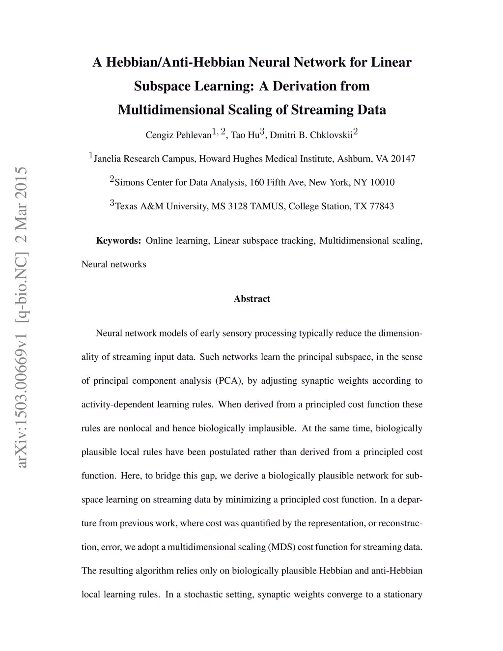 Neural network models of early sensory processing typically reduce the dimensionality of streaming input data. Such networks learn the principal subspace, in the sense of principal component analysis (PCA), by adjusting synaptic weights according to activity-dependent learning rules. When derived from a principled cost function these rules are nonlocal and hence biologically implausible. At the same time, biologically plausible local rules have been postulated rather than derived from a principled cost function. Here, to bridge this gap, we derive a biologically plausible network for subspace learning on streaming data by minimizing a principled cost function. In a departure from previous work, where cost was quantified by the representation, or reconstruction, error, we adopt a multidimensional scaling (MDS) cost function for streaming data. The resulting algorithm relies only on biologically plausible Hebbian and anti-Hebbian local learning rules. In a stochastic setting, synaptic weights converge to a stationary state which projects the input data onto the principal subspace. If the data are generated by a nonstationary distribution, the network can track the principal subspace. Thus, our result makes a step towards an algorithmic theory of neural computation.