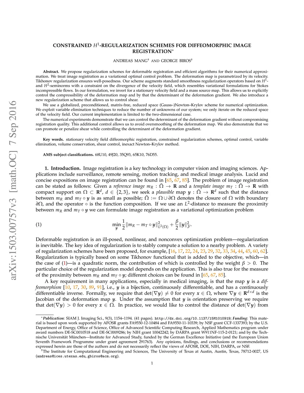 We propose regularization schemes for deformable registration and efficient algorithms for their numerical approximation. We treat image registration as a variational optimal control problem. The deformation map is parametrized by its velocity. Tikhonov regularization ensures well-posedness. Our scheme augments standard smoothness regularization operators based on - and -seminorms with a constraint on the divergence of the velocity field, which resembles variational formulations for Stokes incompressible flows. In our formulation, we invert for a stationary velocity field and a mass source map. This allows us to explicitly control the compressibility of the deformation map and by that the determinant of the deformation gradient. We also introduce a new regularization scheme that allows us to control shear. We use a globalized, preconditioned, matrix-free, reduced space (Gauss--)Newton--Krylov scheme for numerical optimization. We exploit variable elimination techniques to reduce the number of unknowns of our system; we only iterate on the reduced space of the velocity field. Our current implementation is limited to the two-dimensional case. The numerical experiments demonstrate that we can control the determinant of the deformation gradient without compromising registration quality. This additional control allows us to avoid oversmoothing of the deformation map. We also demonstrate that we can promote or penalize shear while controlling the determinant of the deformation gradient.