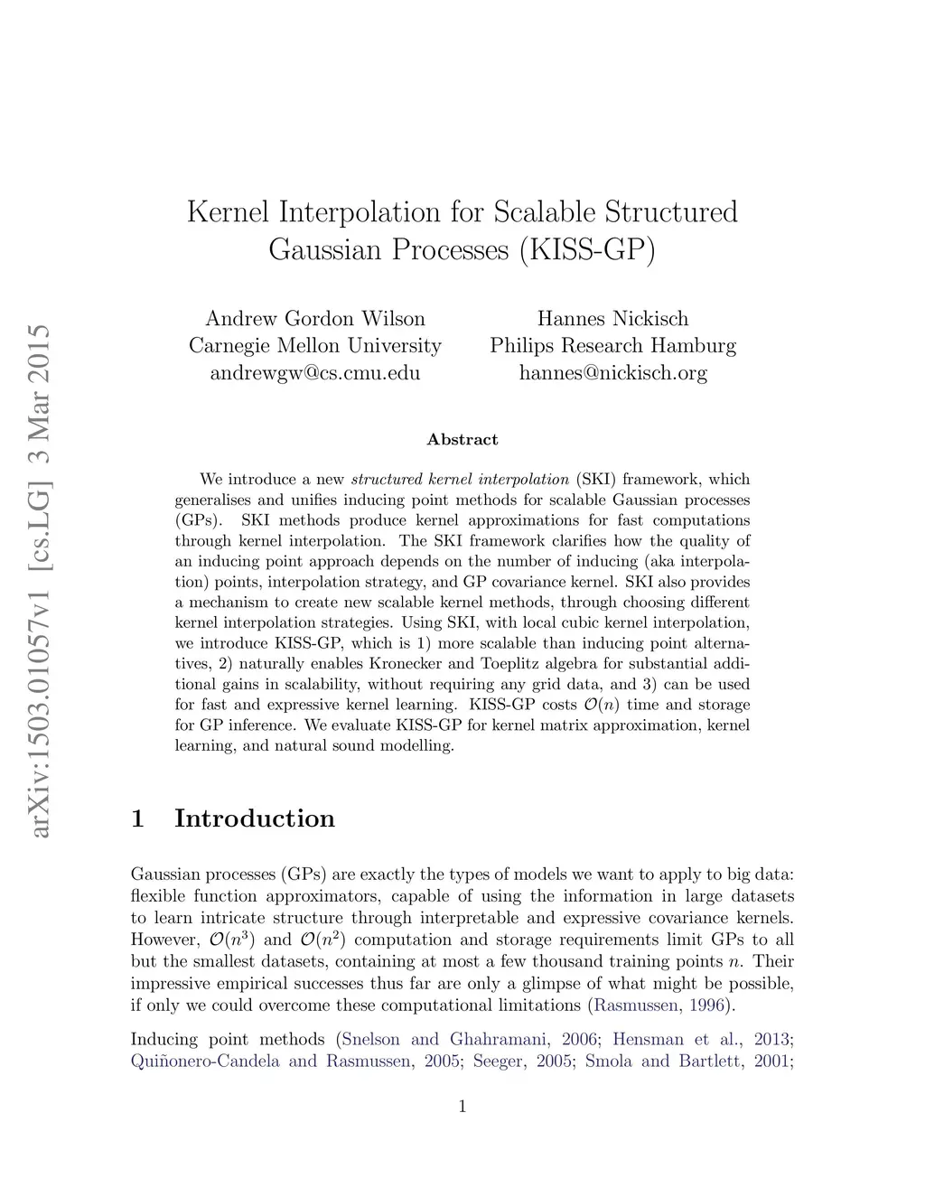 We introduce a new structured kernel interpolation (SKI) framework, which generalises and unifies inducing point methods for scalable Gaussian processes (GPs). SKI methods produce kernel approximations for fast computations through kernel interpolation. The SKI framework clarifies how the quality of an inducing point approach depends on the number of inducing (aka interpolation) points, interpolation strategy, and GP covariance kernel. SKI also provides a mechanism to create new scalable kernel methods, through choosing different kernel interpolation strategies. Using SKI, with local cubic kernel interpolation, we introduce KISS-GP, which is 1) more scalable than inducing point alternatives, 2) naturally enables Kronecker and Toeplitz algebra for substantial additional gains in scalability, without requiring any grid data, and 3) can be used for fast and expressive kernel learning. KISS-GP costs O(n) time and storage for GP inference. We evaluate KISS-GP for kernel matrix approximation, kernel learning, and natural sound modelling.