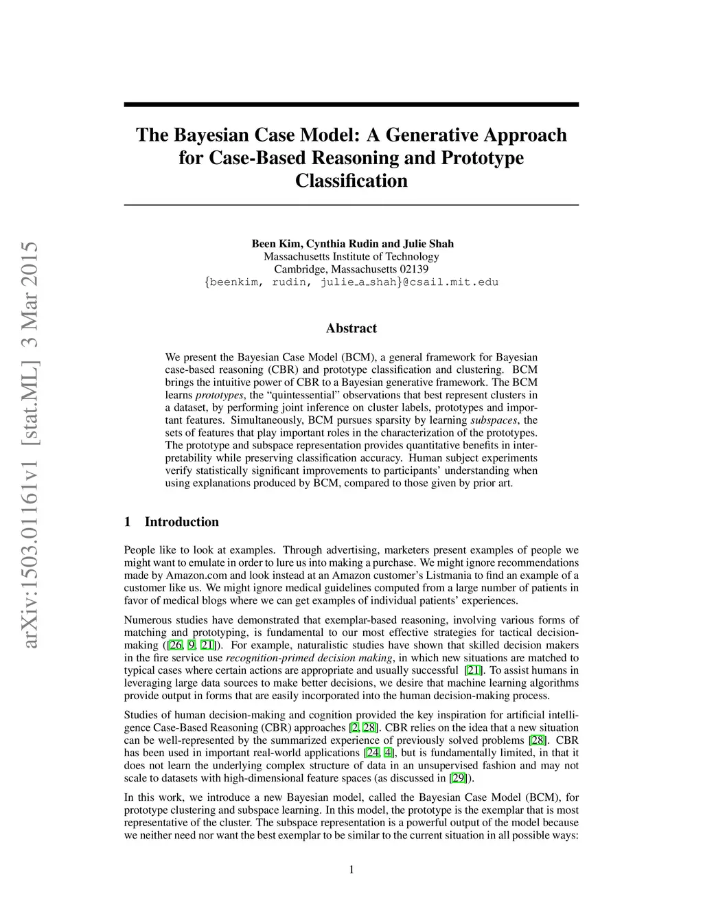 We present the Bayesian Case Model (BCM), a general framework for Bayesian case-based reasoning (CBR) and prototype classification and clustering. BCM brings the intuitive power of CBR to a Bayesian generative framework. The BCM learns prototypes, the "quintessential" observations that best represent clusters in a dataset, by performing joint inference on cluster labels, prototypes and important features. Simultaneously, BCM pursues sparsity by learning subspaces, the sets of features that play important roles in the characterization of the prototypes. The prototype and subspace representation provides quantitative benefits in interpretability while preserving classification accuracy. Human subject experiments verify statistically significant improvements to participants' understanding when using explanations produced by BCM, compared to those given by prior art.