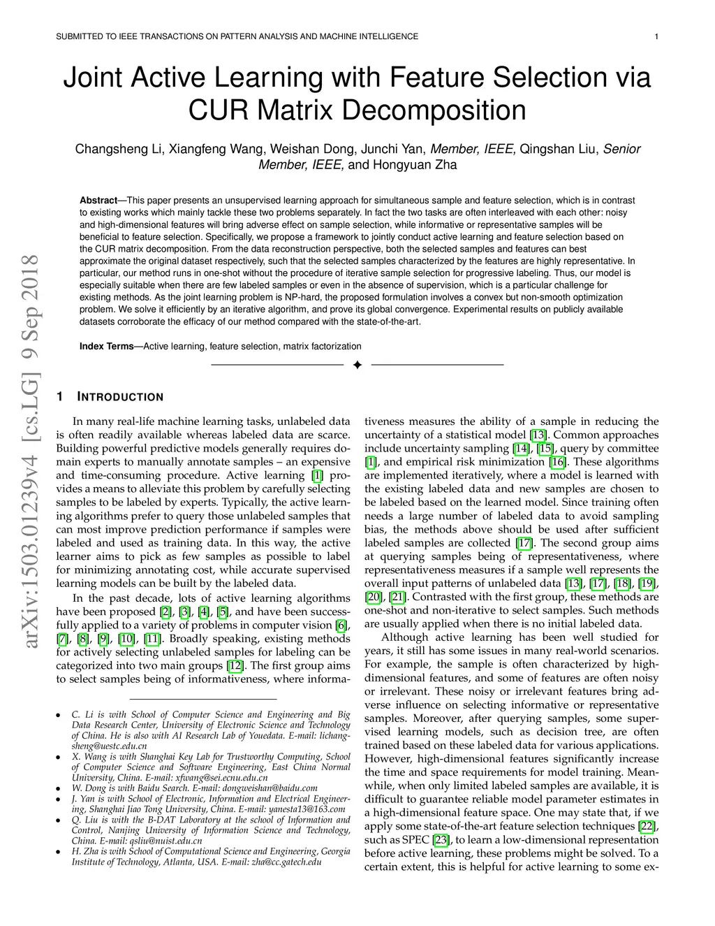 Joint Active Learning with Feature Selection via CUR Matrix