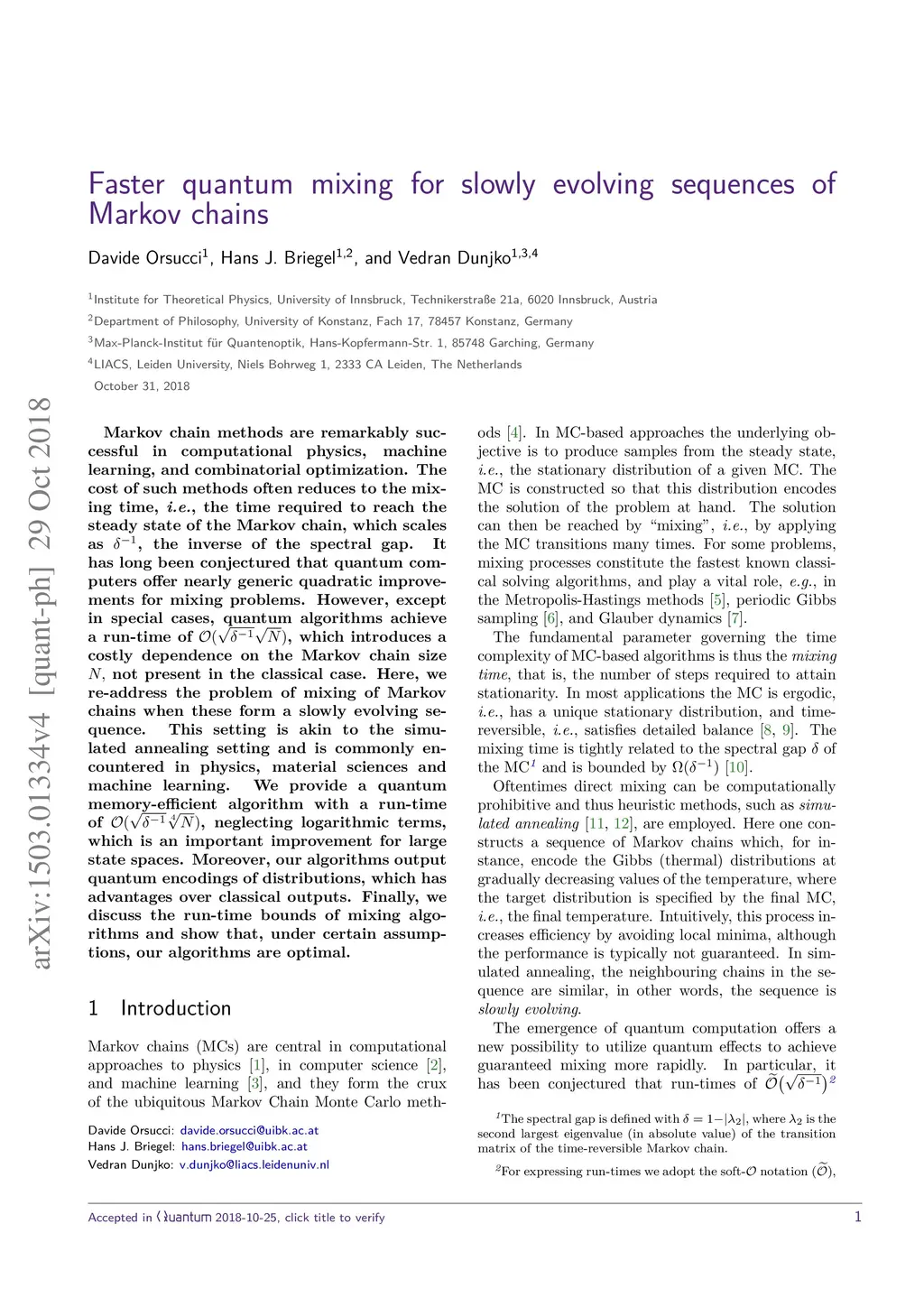 Markov chain methods are remarkably successful in computational physics, machine learning, and combinatorial optimization. The cost of such methods often reduces to the mixing time, i.e., the time required to reach the steady state of the Markov chain, which scales as , the inverse of the spectral gap. It has long been conjectured that quantum computers offer nearly generic quadratic improvements for mixing problems. However, except in special cases, quantum algorithms achieve a run-time of , which introduces a costly dependence on the Markov chain size not present in the classical case. Here, we re-address the problem of mixing of Markov chains when these form a slowly evolving sequence. This setting is akin to the simulated annealing setting and is commonly encountered in physics, material sciences and machine learning. We provide a quantum memory-efficient algorithm with a run-time of , neglecting logarithmic terms, which is an important improvement for large state spaces. Moreover, our algorithms output quantum encodings of distributions, which has advantages over classical outputs. Finally, we discuss the run-time bounds of mixing algorithms and show that, under certain assumptions, our algorithms are optimal.