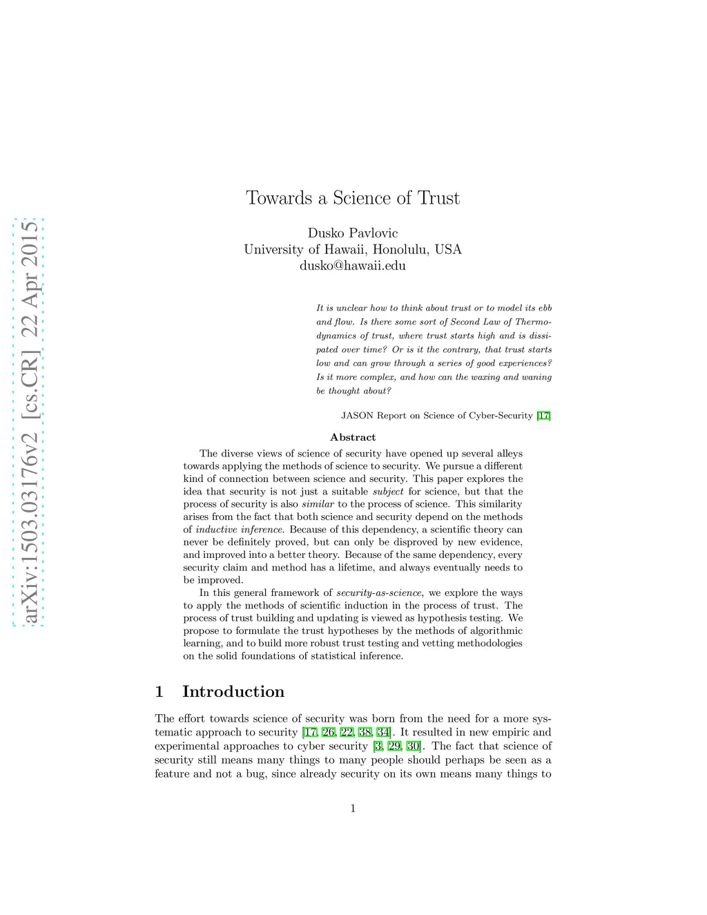 The diverse views of science of security have opened up several alleys towards applying the methods of science to security. We pursue a different kind of connection between science and security. This paper explores the idea that security is not just a suitable subject for science, but that the process of security is also similar to the process of science. This similarity arises from the fact that both science and security depend on the methods of inductive inference. Because of this dependency, a scientific theory can never be definitely proved, but can only be disproved by new evidence, and improved into a better theory. Because of the same dependency, every security claim and method has a lifetime, and always eventually needs to be improved. In this general framework of security-as-science, we explore the ways to apply the methods of scientific induction in the process of trust. The process of trust building and updating is viewed as hypothesis testing. We propose to formulate the trust hypotheses by the methods of algorithmic learning, and to build more robust trust testing and vetting methodologies on the solid foundations of statistical inference.