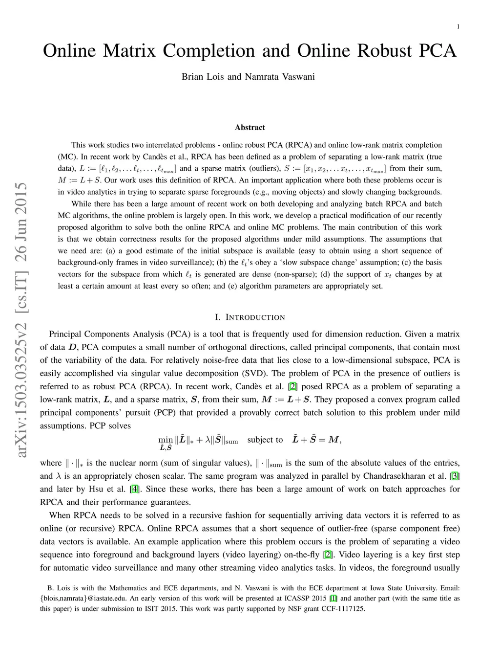 This work studies two interrelated problems - online robust PCA (RPCA) and online low-rank matrix completion (MC). In recent work by Cand\`{e}s et al., RPCA has been defined as a problem of separating a low-rank matrix (true data), and a sparse matrix (outliers), from their sum, . Our work uses this definition of RPCA. An important application where both these problems occur is in video analytics in trying to separate sparse foregrounds (e.g., moving objects) and slowly changing backgrounds. While there has been a large amount of recent work on both developing and analyzing batch RPCA and batch MC algorithms, the online problem is largely open. In this work, we develop a practical modification of our recently proposed algorithm to solve both the online RPCA and online MC problems. The main contribution of this work is that we obtain correctness results for the proposed algorithms under mild assumptions. The assumptions that we need are: (a) a good estimate of the initial subspace is available (easy to obtain using a short sequence of background-only frames in video surveillance); (b) the 's obey a `slow subspace change' assumption; (c) the basis vectors for the subspace from which is generated are dense (non-sparse); (d) the support of changes by at least a certain amount at least every so often; and (e) algorithm parameters are appropriately set