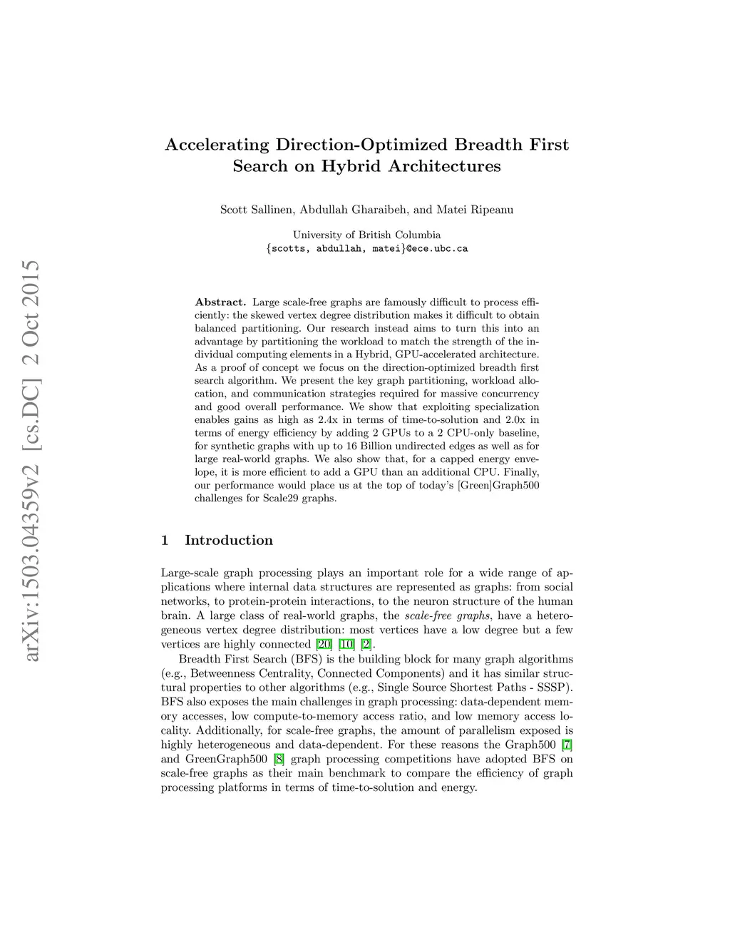 Large scale-free graphs are famously difficult to process efficiently: the skewed vertex degree distribution makes it difficult to obtain balanced partitioning. Our research instead aims to turn this into an advantage by partitioning the workload to match the strength of the individual computing elements in a Hybrid, GPU-accelerated architecture. As a proof of concept we focus on the direction-optimized breadth first search algorithm. We present the key graph partitioning, workload allocation, and communication strategies required for massive concurrency and good overall performance. We show that exploiting specialization enables gains as high as 2.4x in terms of time-to-solution and 2.0x in terms of energy efficiency by adding 2 GPUs to a 2 CPU-only baseline, for synthetic graphs with up to 16 Billion undirected edges as well as for large real-world graphs. We also show that, for a capped energy envelope, it is more efficient to add a GPU than an additional CPU. Finally, our performance would place us at the top of today's [Green]Graph500 challenges for Scale29 graphs.