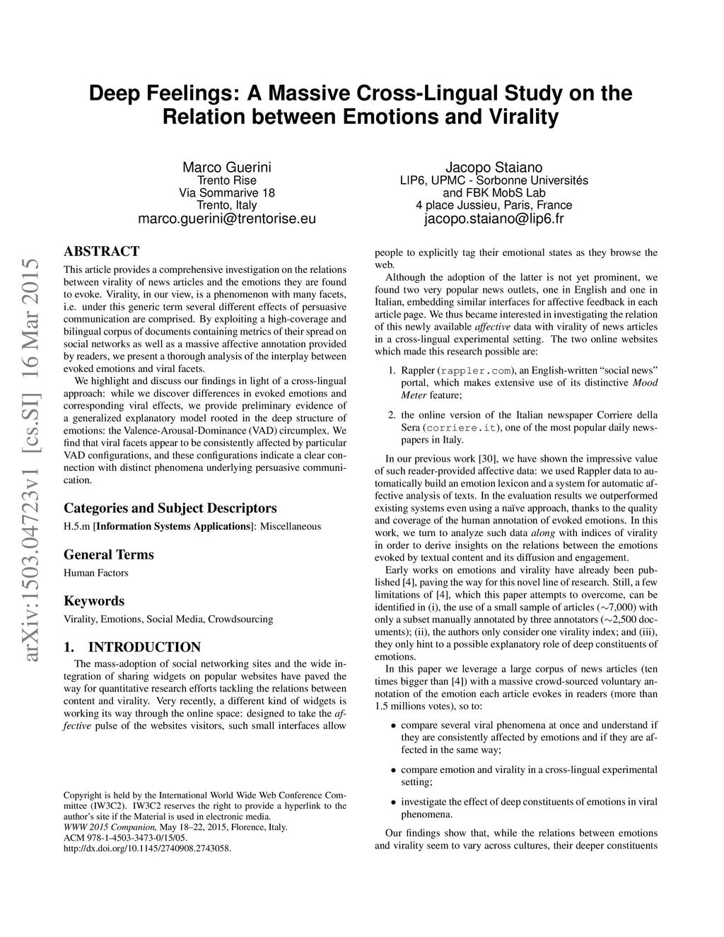 This article provides a comprehensive investigation on the relations between virality of news articles and the emotions they are found to evoke. Virality, in our view, is a phenomenon with many facets, i.e. under this generic term several different effects of persuasive communication are comprised. By exploiting a high-coverage and bilingual corpus of documents containing metrics of their spread on social networks as well as a massive affective annotation provided by readers, we present a thorough analysis of the interplay between evoked emotions and viral facets. We highlight and discuss our findings in light of a cross-lingual approach: while we discover differences in evoked emotions and corresponding viral effects, we provide preliminary evidence of a generalized explanatory model rooted in the deep structure of emotions: the Valence-Arousal-Dominance (VAD) circumplex. We find that viral facets appear to be consistently affected by particular VAD configurations, and these configurations indicate a clear connection with distinct phenomena underlying persuasive communication.