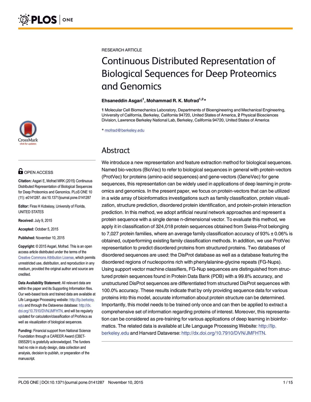 ProtVec: A Continuous Distributed Representation of Biological Sequences